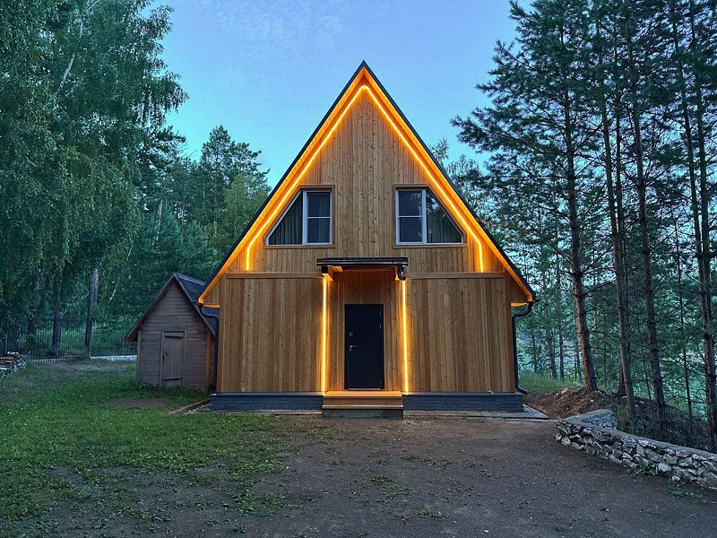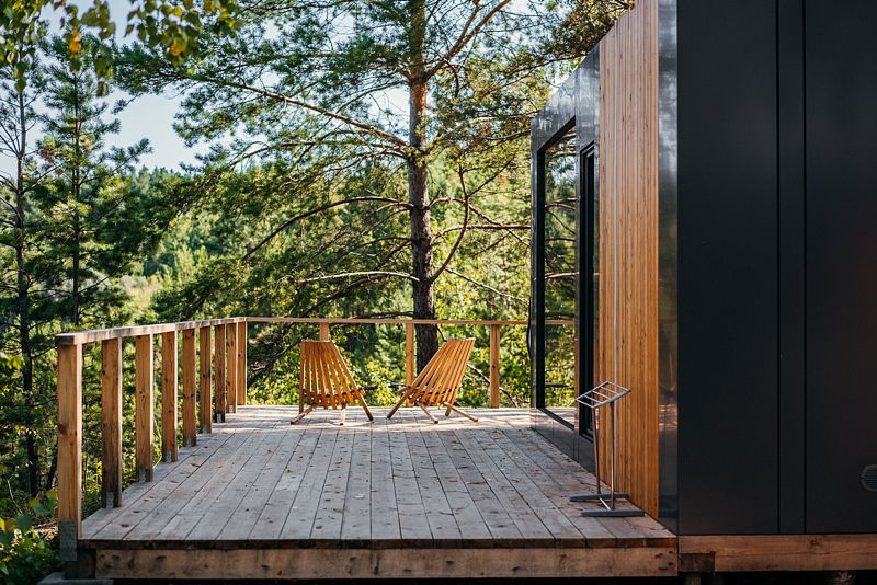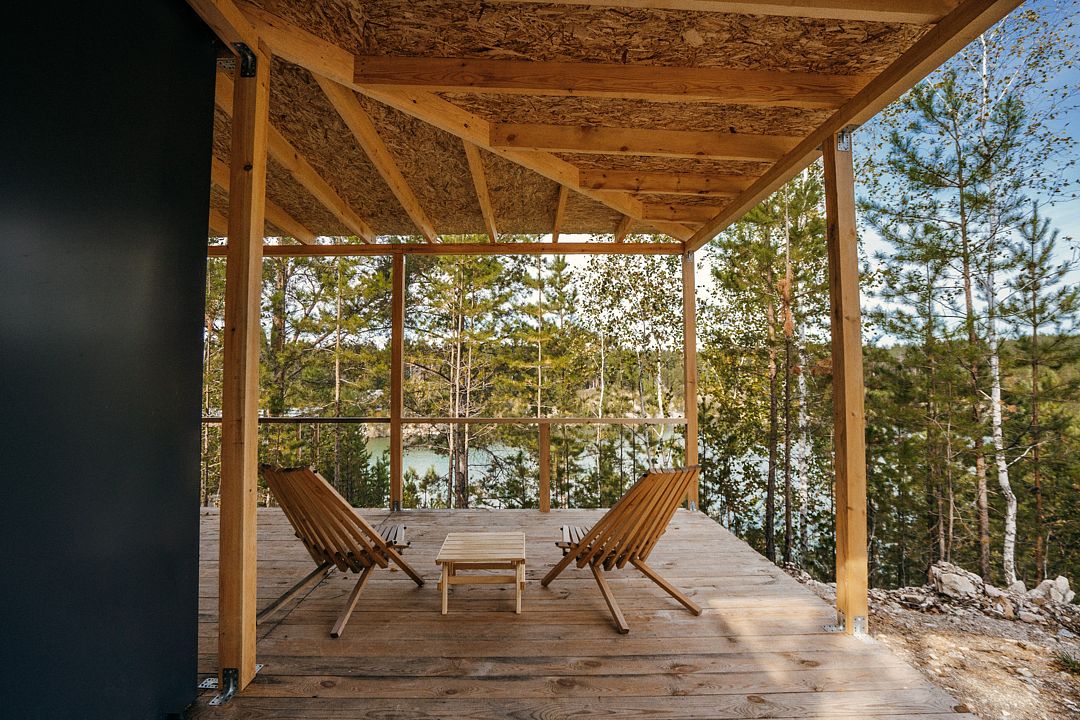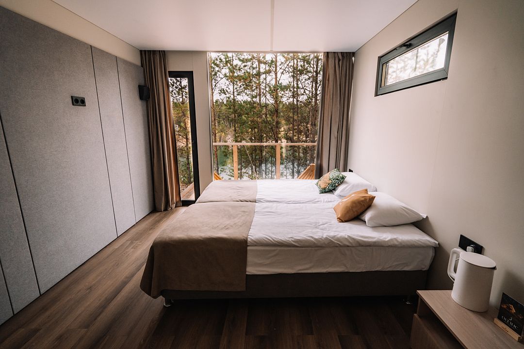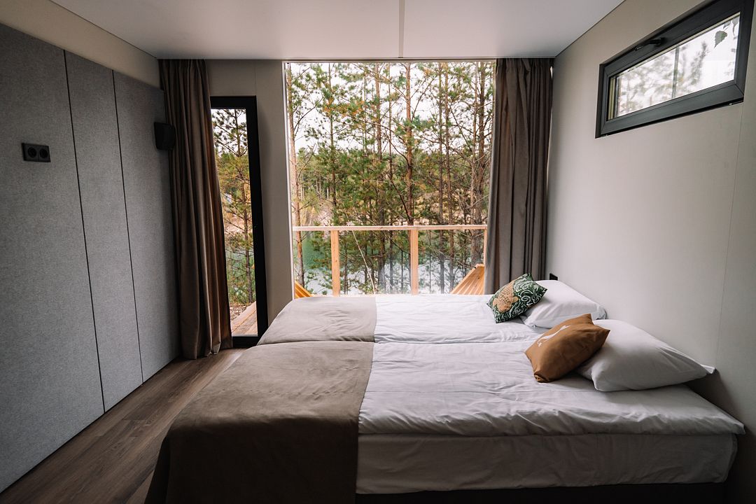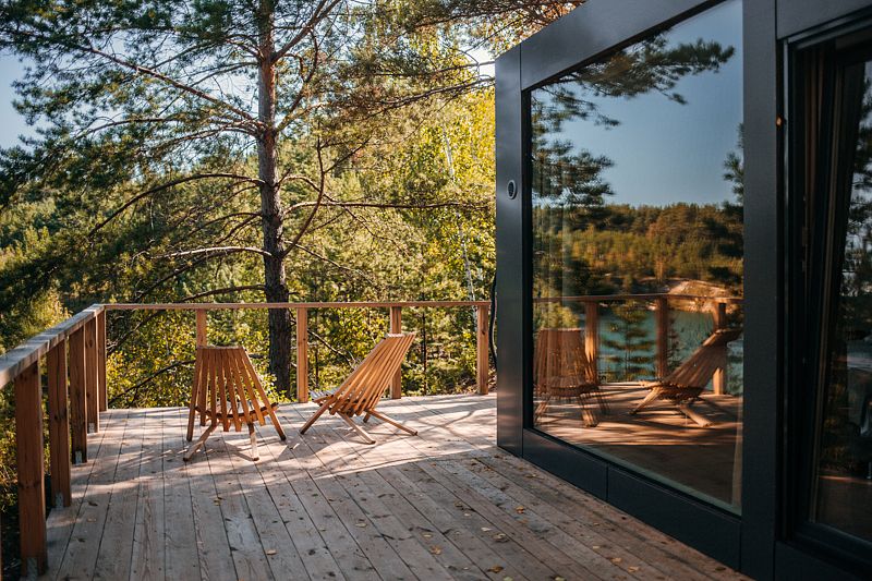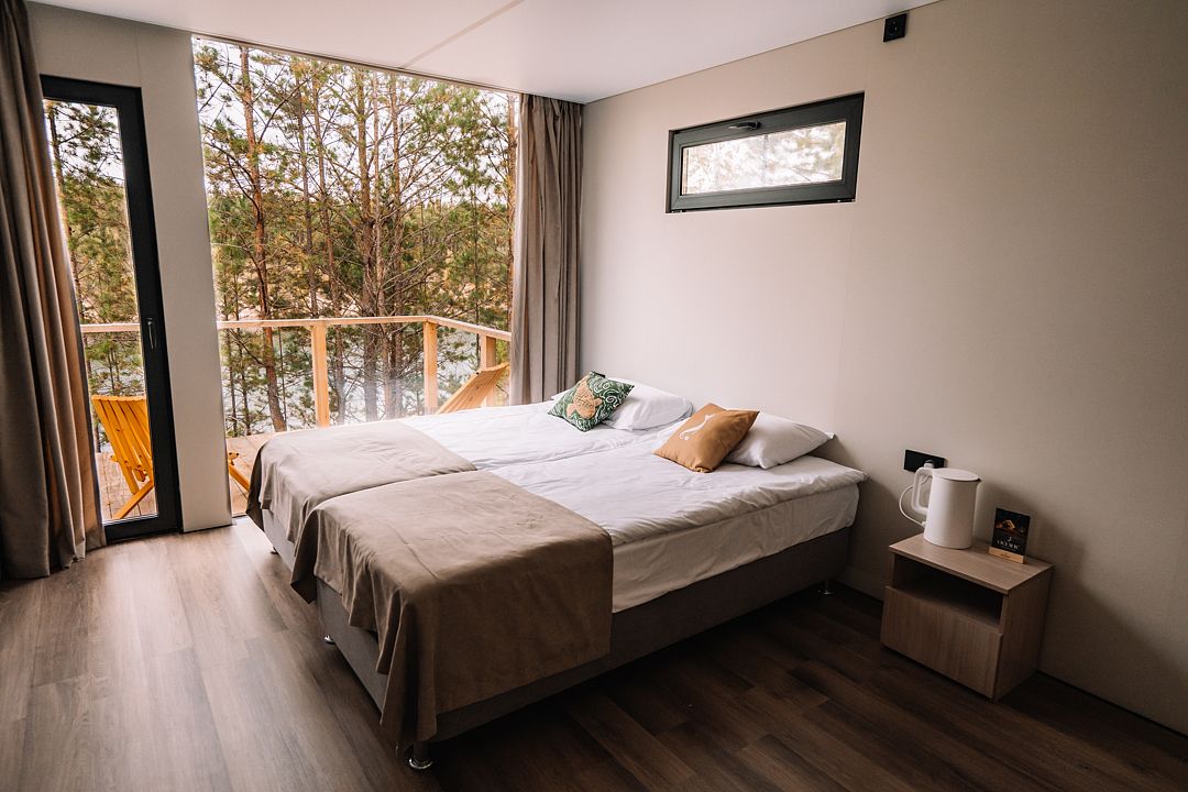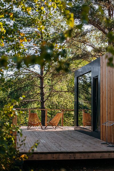 Отдельно стоящий благоустроенный вариант размещения с большим панорамным окном в пол, санузлом и видом на лес и озеро.