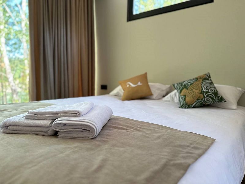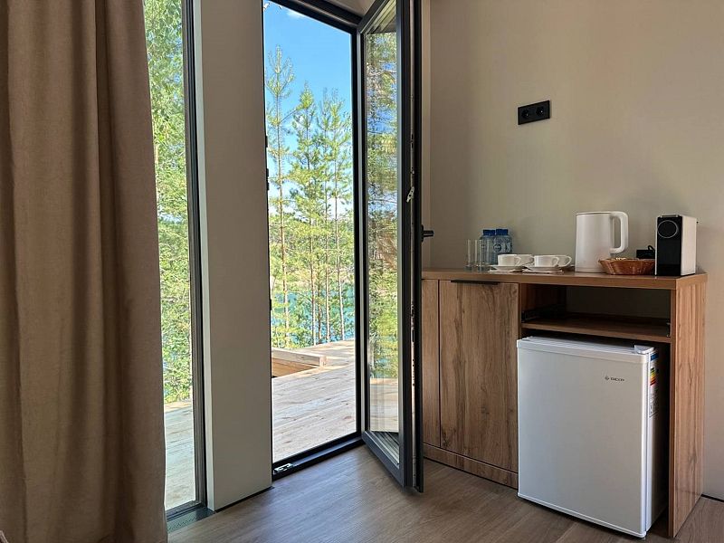 Отдельно стоящий благоустроенный вариант размещения с большим панорамным окном в пол, санузлом и видом на мраморное озеро.