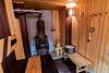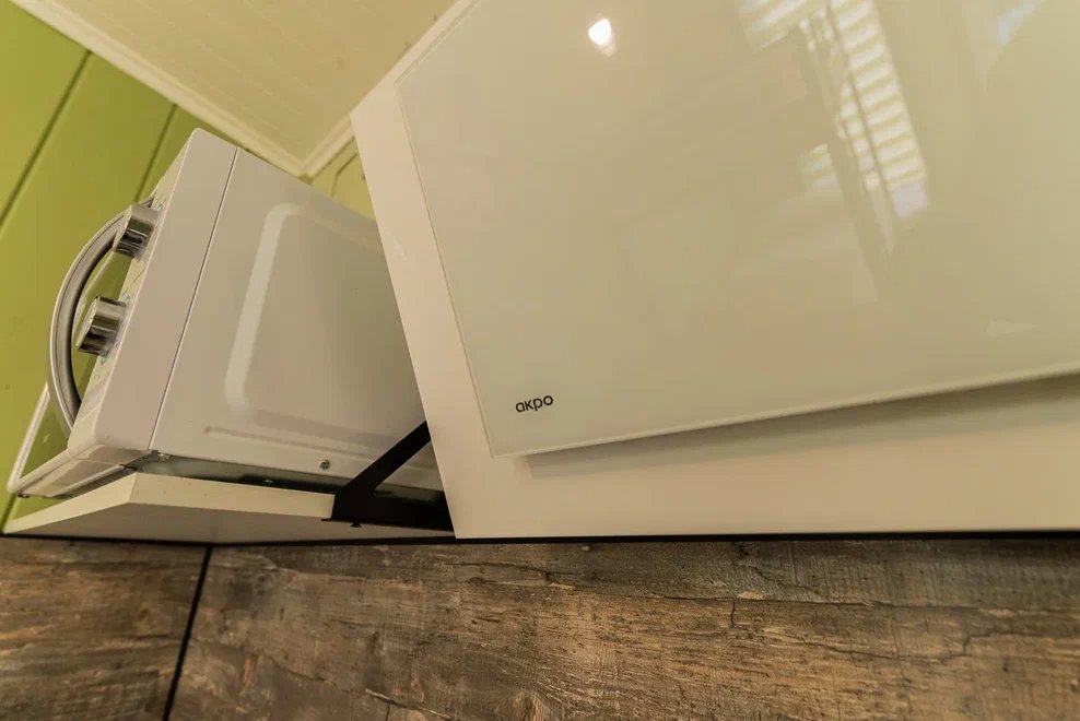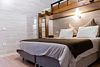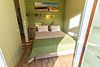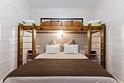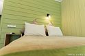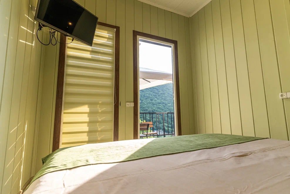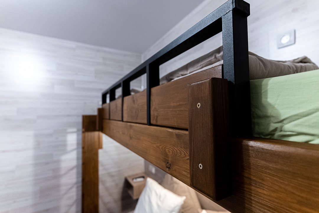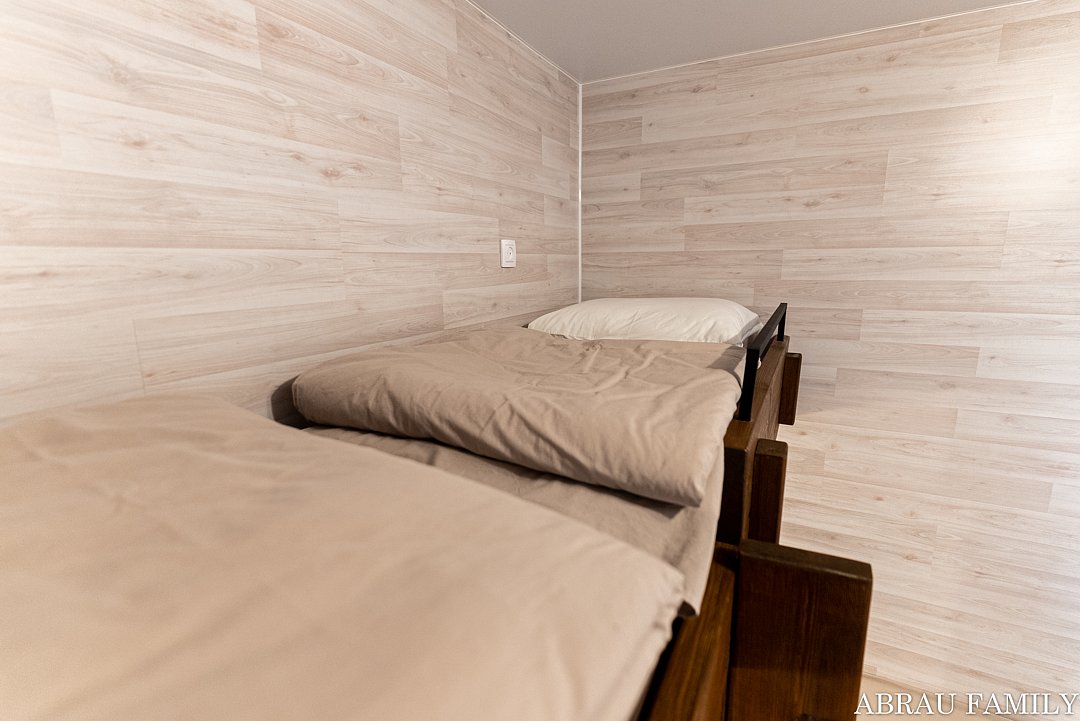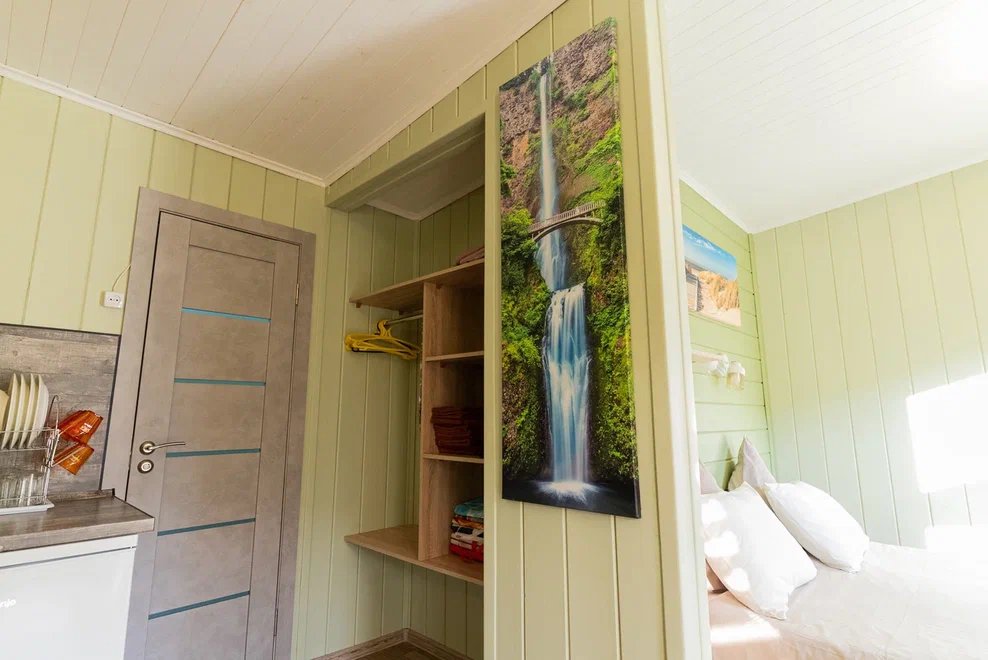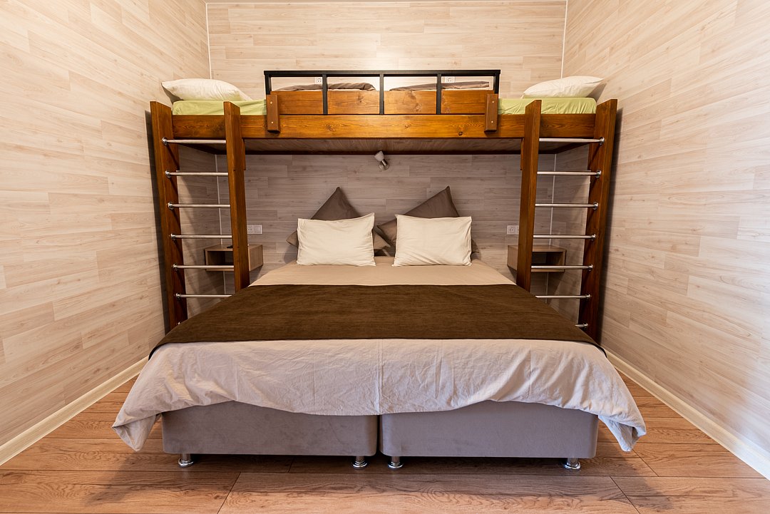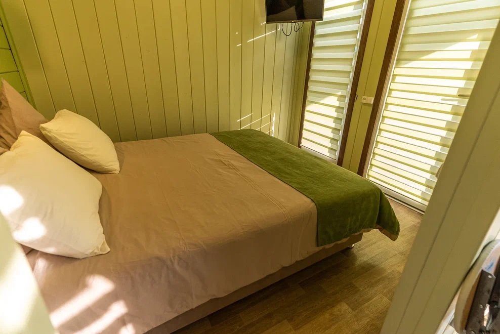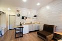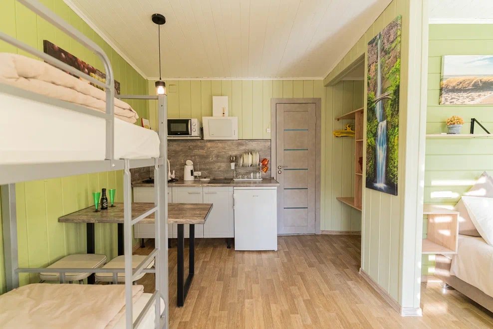 «Студия мини» идеально подходит для размещения двух взрослых гостей, максимум одного ребенка. В домике расположена двухъярусная кровать (нижний ярус шириной один метр двадцать сантиметров, верхний ярус шириной девяносто сантиметров).