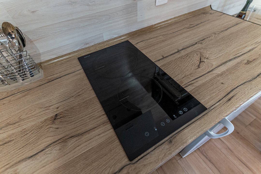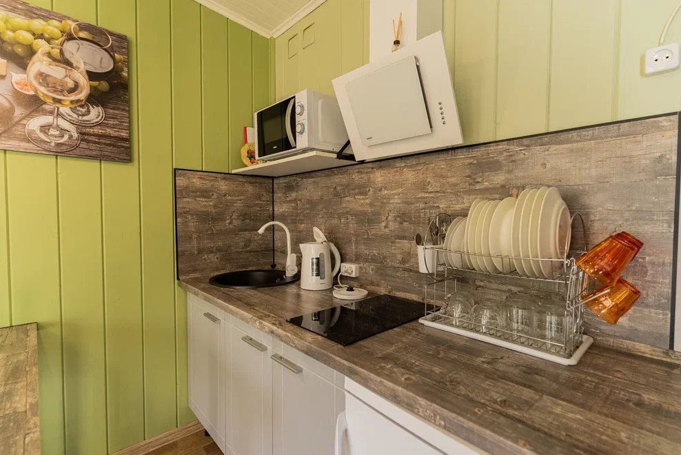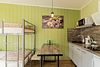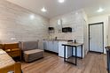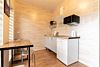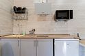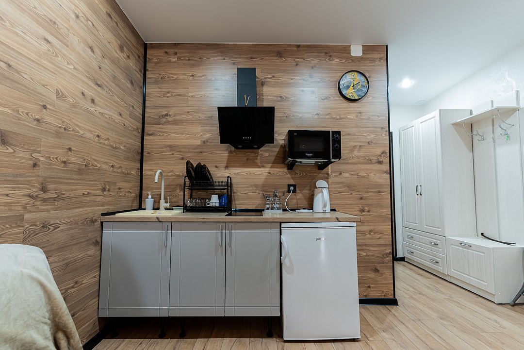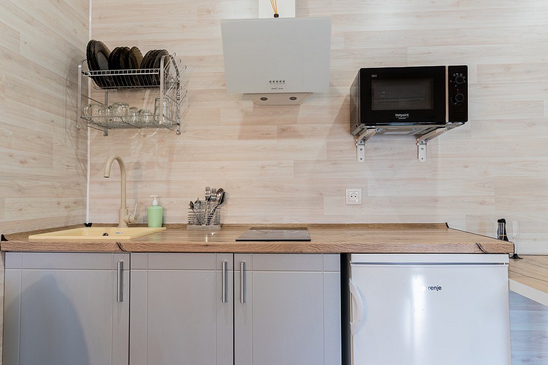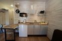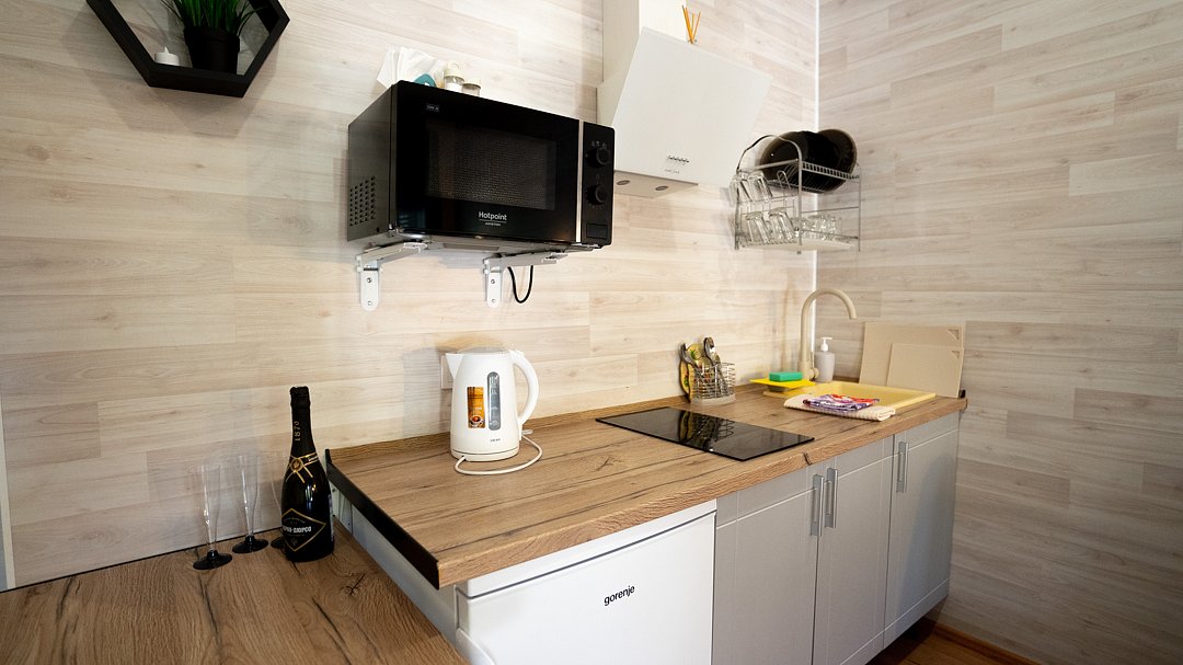 Апартаментах расположена кухня (варочная поверхность на две конфорки, холодильник, раковина и полный комплект посуды). В Апартаментах есть все, что нужно для комфортного проживания. Для проживания более двух человек имеется кресло-кровать.