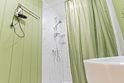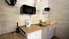 Ванная комната оснащена всем необходимым (душем, санузлом, раковиной с зеркалом, феном, туалетными принадлежностями). В номере расположена кухня (варочная поверхность на две конфорки, холодильник, раковина и полный комплект посуды).