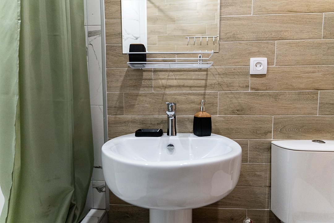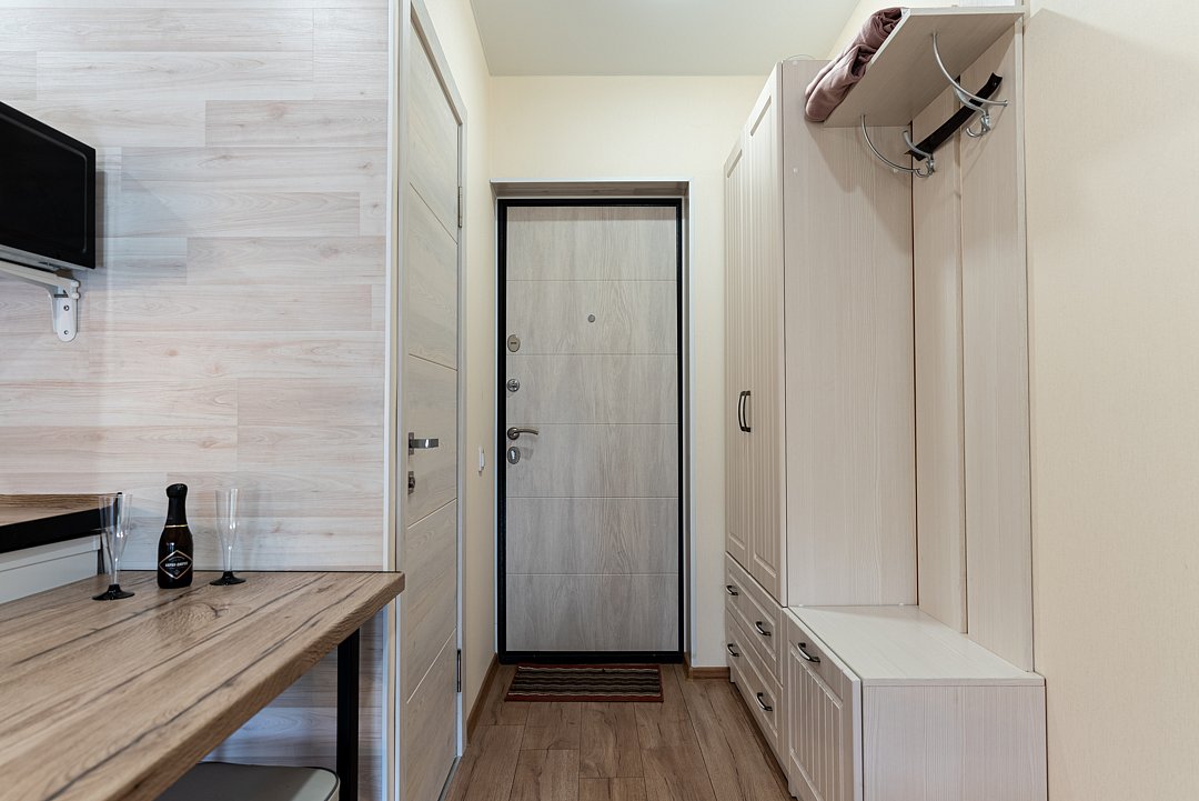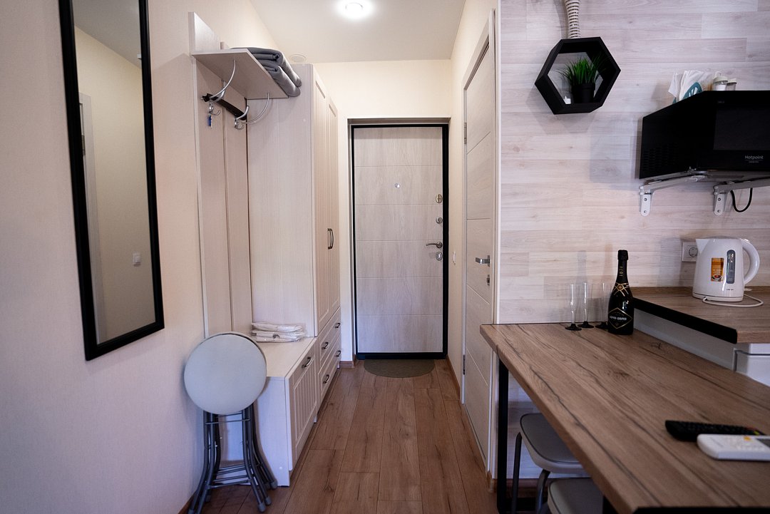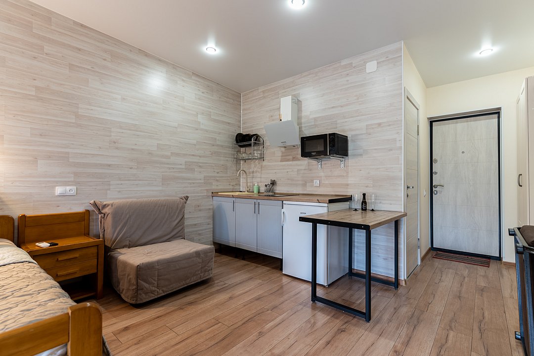 Квартира-студия отлично подходит для проживания как двух взрослых гостей, так и трех взрослых гостей. В апартаментах имеется: удобная двухспальная кровать с прикроватными тумбочками, телевизором, шкафом, гладильной доской и утюгом. Ванная комната оснащена всем необходимым (душем, санузлом, раковиной с зеркалом, феном, туалетными принадлежностями, наборы полотенец, тапочки).