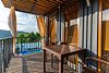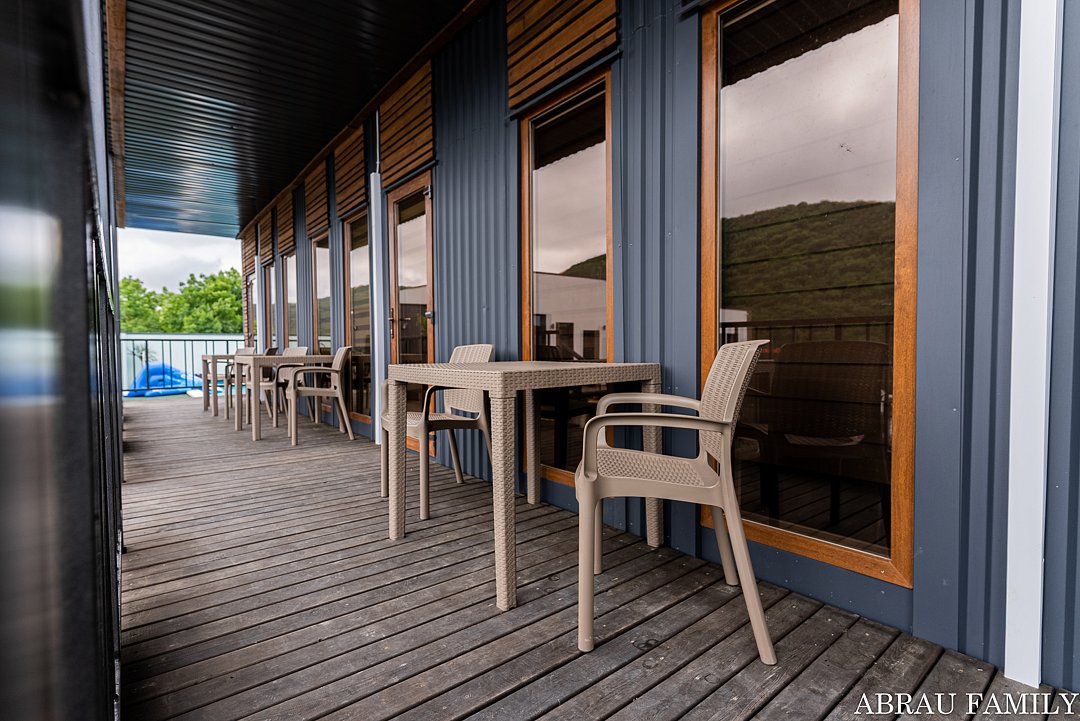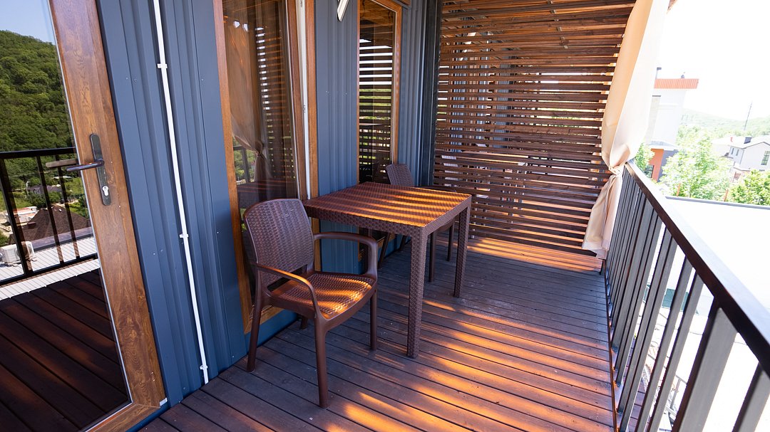 Перед номером расположена просторная терраса с креслами и столом для отдыха, площадь террасы составляет 12 м². Здесь можно наслаждаться свежим воздухом и красивым видом на горы.