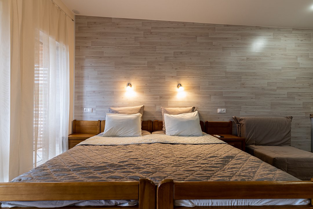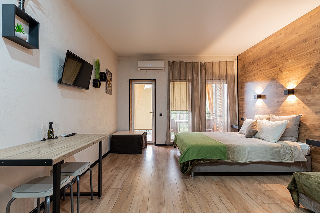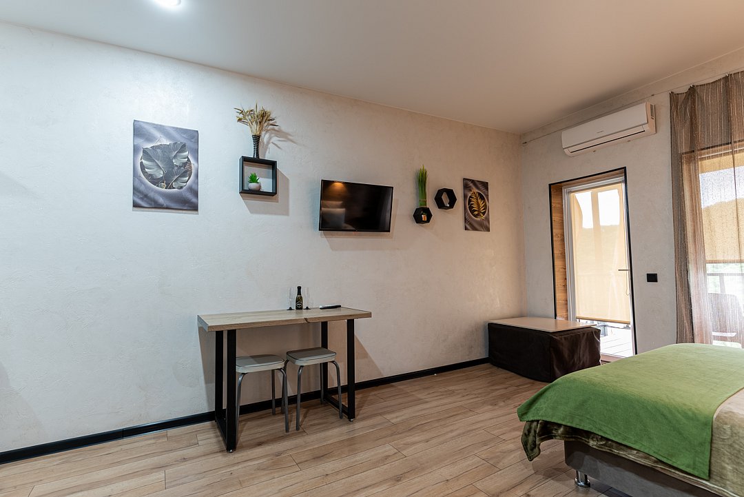 Квартира-студия в гостевом доме идеально подходит для проживания как двух взрослых гостей, так и троих взрослых гостей. В апартаментах есть: удобная двуспальная кровать с прикроватными тумбочками, телевизором, шкафом, гладильной доской и утюгом.