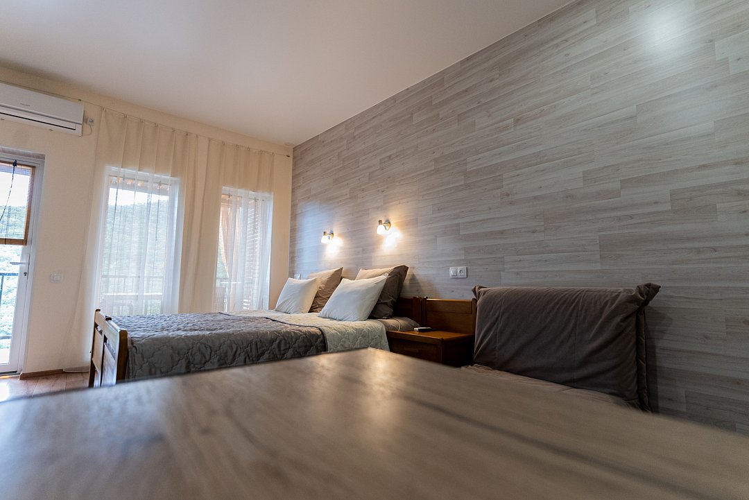 Этот номер идеально подходит для большой семьи. Здесь могут разместиться двое взрослых и пятеро детей или четверо взрослых и двое детей. Комната №1: уютная двуспальная кровать с прикроватными тумбочками, телевизор, шкаф, сплит-система. В санузле — унитаз и раковина.