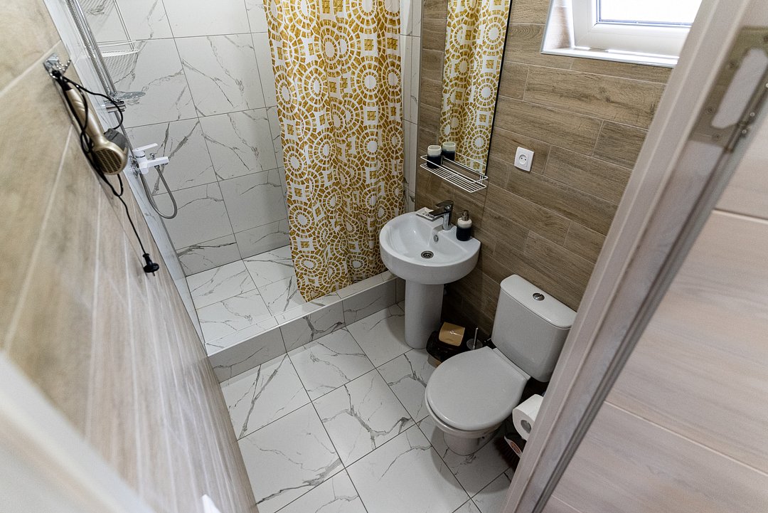 Ванная комната оснащена всем необходимым (душем, санузлом, раковиной с зеркалом, феном, туалетными принадлежностями). В апартаментах имеется: удобная двуспальная кровать с прикроватными тумбочками, телевизором, шкафом, гладильной доской и утюгом.
