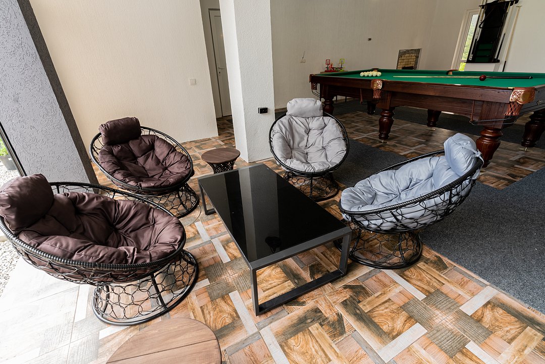 На территории гостевого дома гостей ждёт широкий спектр удобств: современный бассейн с раздвижным навесом, банный комплекс с настоящей русской парной, а также просторная зона барбекю с мангалами и крытой беседкой. Для маленьких путешественников оборудована безопасная и увлекательная детская площадка с горками, батутом, детским бильярдом и аэрохоккеем, а при необходимости можно заказать праздничную анимацию, которая сделает отдых детей незабываемым.