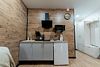 В номере расположена кухня (варочная поверхность на две конфорки, холодильник, раковина и полный комплект посуды). В номере есть все, что нужно для комфортного проживания. Прекрасный номер, архитектурное решение которого создает ощущение пространства и наполненности светом и воздухом. Вид из апартаментов на горы.