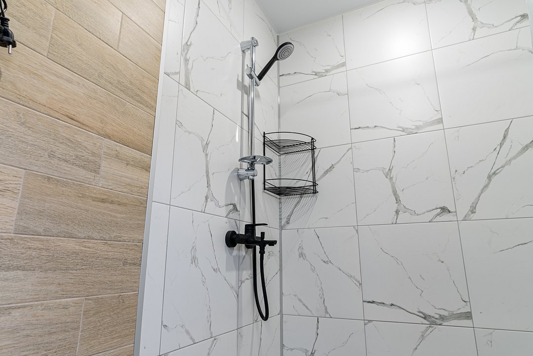 Общие удобства: просторная кухня (11 м²) с мебелью и всем необходимым: варочная поверхность на две конфорки, холодильник, раковина и полный набор посуды. Также есть гладильная доска и утюг. Одна душевая комната на две комнаты оснащена всем необходимым: душем, зеркалом, феном, туалетными принадлежностями, наборами полотенец и тапочками.