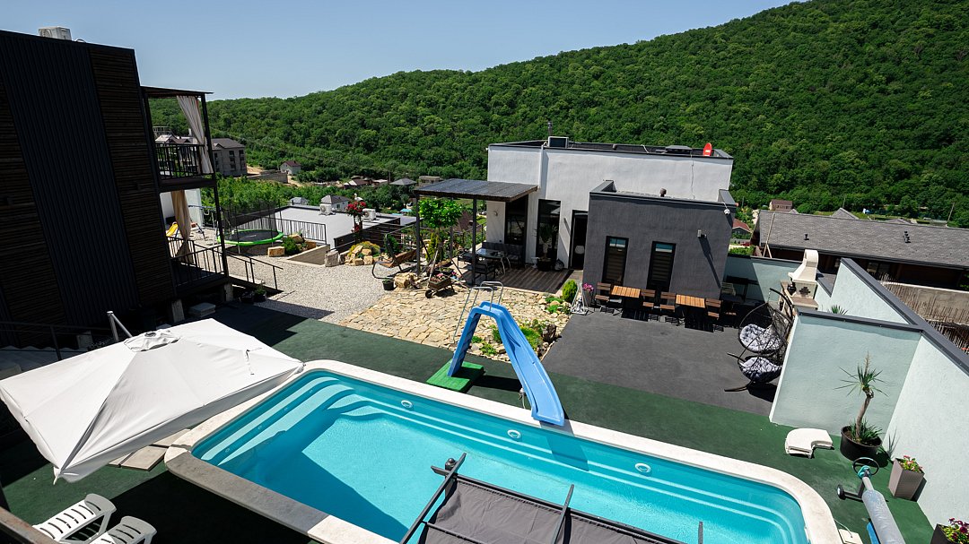 На территории вы можете насладиться свежестью утренней воды в бассейне, наслаждаясь горными пейзажами вокруг. В пешей доступности для Вас чистейшее озеро Абрау, а также пляж Abrau Beach на побережье Черного моря. Отдых, который позволит отдохнуть и телом, и душой.