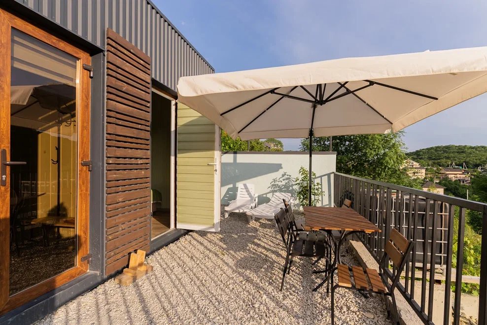 В домике есть все, что нужно для комфортного проживания. Около домика отсутствует зона отдыха. Вы можете наслаждаться утренней и вечерней зоной отдыха в зоне бассейна. Студия расположена на верхней террасе рядом с парковочными местами для машин.