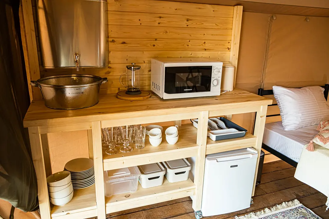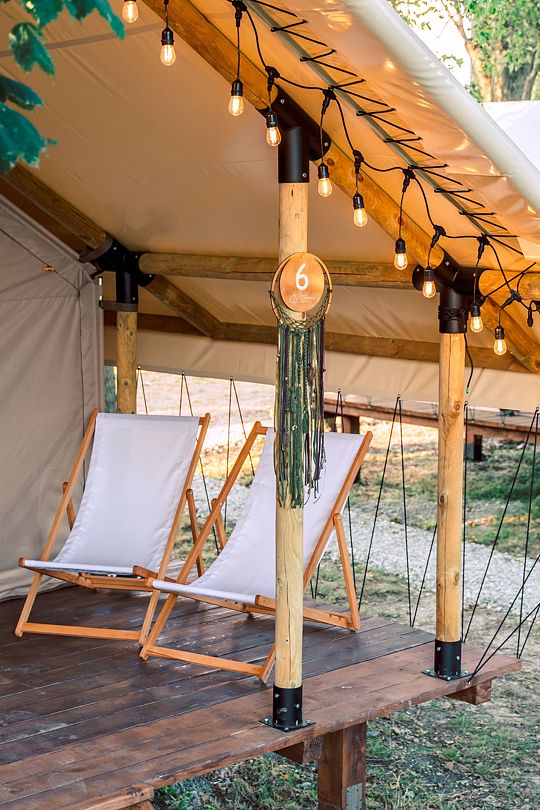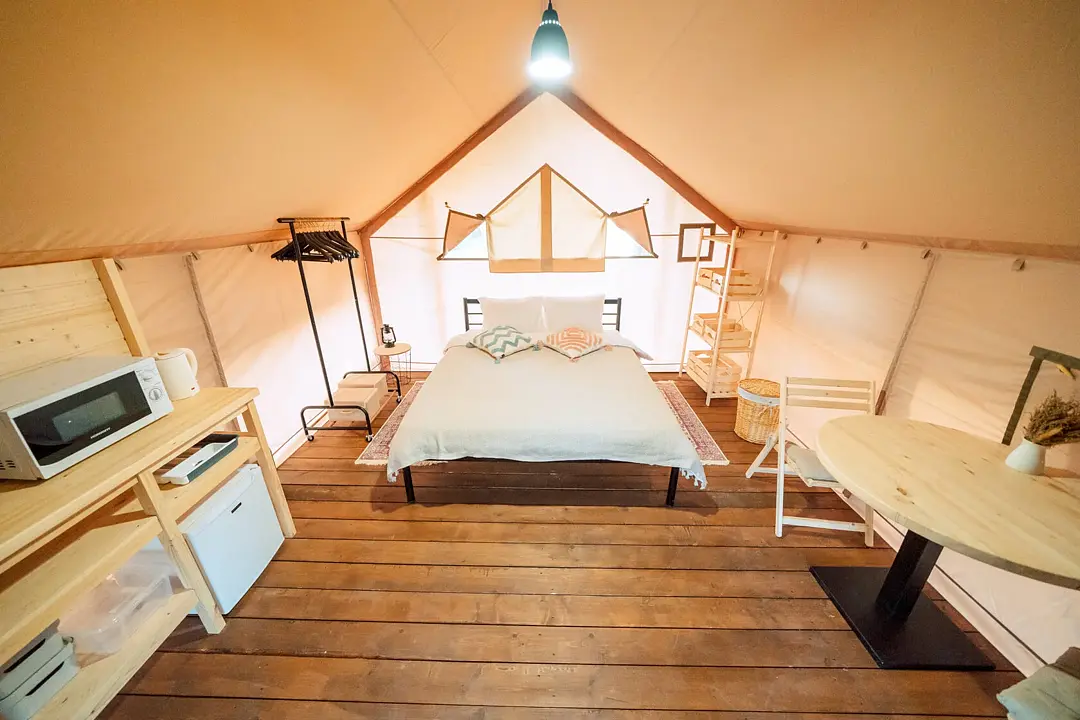 Десять сафари-тентов, предназначенных для тёплого времени года, готовы принять до 28 гостей одновременно, с апреля по ноябрь. Все глэмпы находятся вдоль береговой линии и имеют живописный вид на горное озеро. В каждом из них имеется индивидуальный туалет и душ в санитарном блоке, злектрические конвекторы (отопление) и вентиляторы, кухня, оборудованная бытовой техникой и собственная терраса.