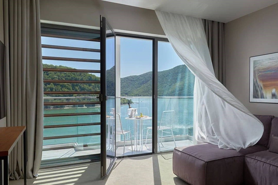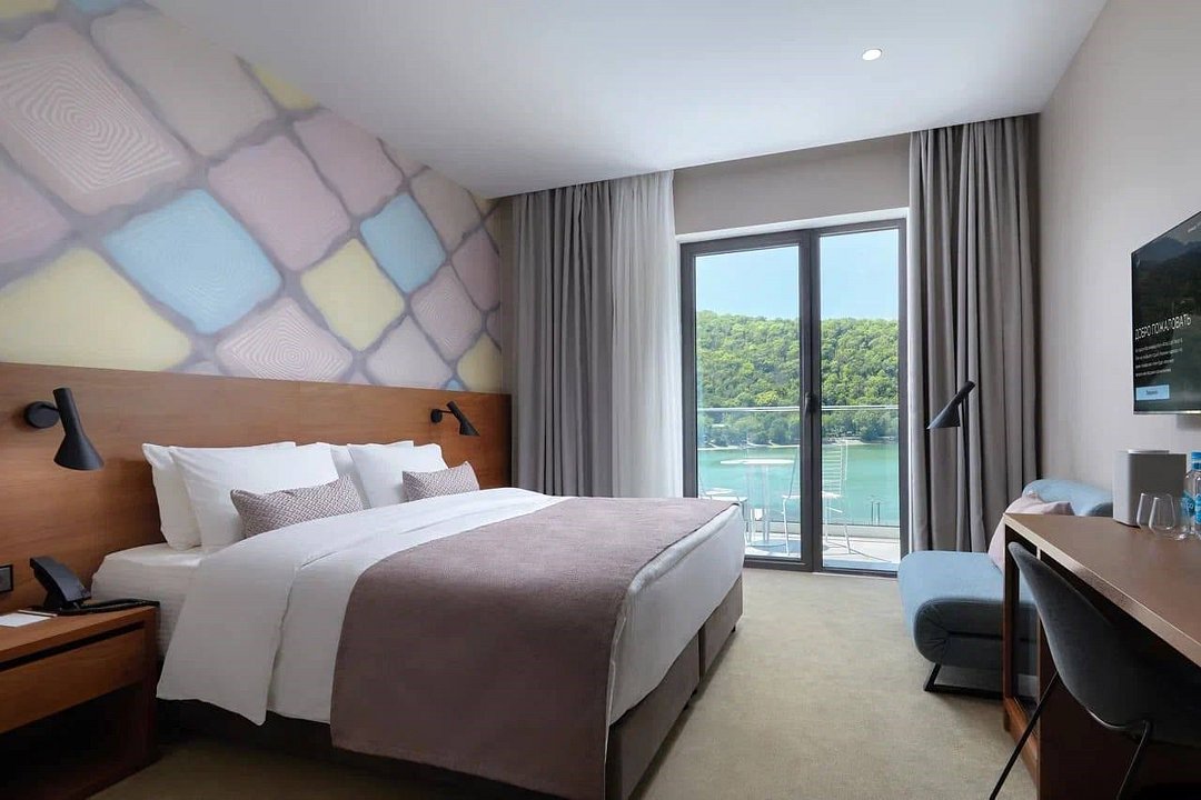 Номера этой категории открывают вид на главную достопримечательность курорта – озеро Абрау. Здесь реализовано понятие «комфорт» в современном понимании: спальня, панорамные окна, шкаф, балкон со столиком и стульями, система «умный дом» с функцией управления климат-контролем, «умная колонка» с голосовым помощником, интерактивное телевидение с возможностью заказа услуг.Услуги и удобства