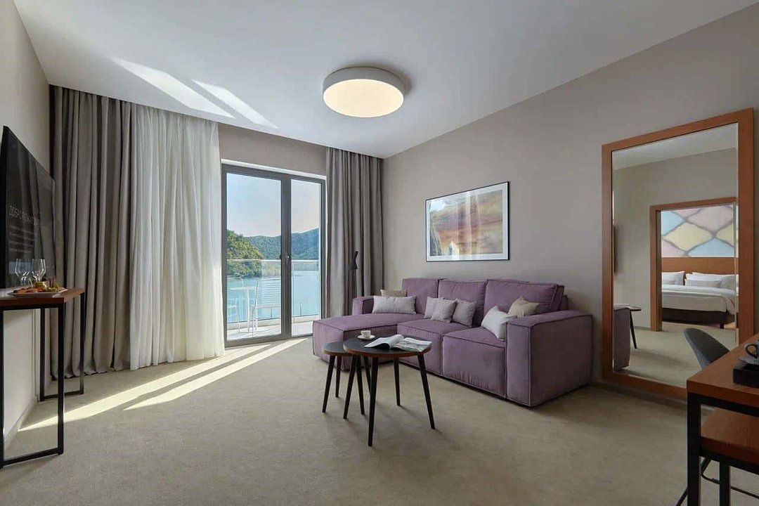 Номер призван подарить гостю незабываемые впечатления от отдыха. Здесь объединены свобода, элегантность и домашнее спокойствие. Люкс разделен на спальню и гостиную. Просторный номер с элегантным дизайном оснащен передовыми технологиями, которые удовлетворят самых искушенных гостей. Из панорамных окон и балкона вы можете наблюдать за умиротворяющим видом на озеро Абрау.Услуги и удобства