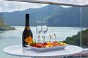 Панорамные окна выходят на озеро Абрау, также имеется видовая терраса для наилучшего обзора. Здесь гости могут насладиться завтраком по системе «шведский стол» с бокалом игристого. В остальное время ресторан работает a la carte.