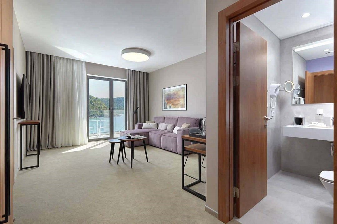 Номер повышенной комфортности с зонированием спальни и гостиной. Простор и пастельные тона располагают к еще большей расслабленности и умиротворению. Панорамные окна открывают взору живописные пейзажи абрауского леса. Номер оснащен системой управления освещением, климат-контролем, музыкальным сопровождением, а также заказами по системе room-service.Услуги и удобства