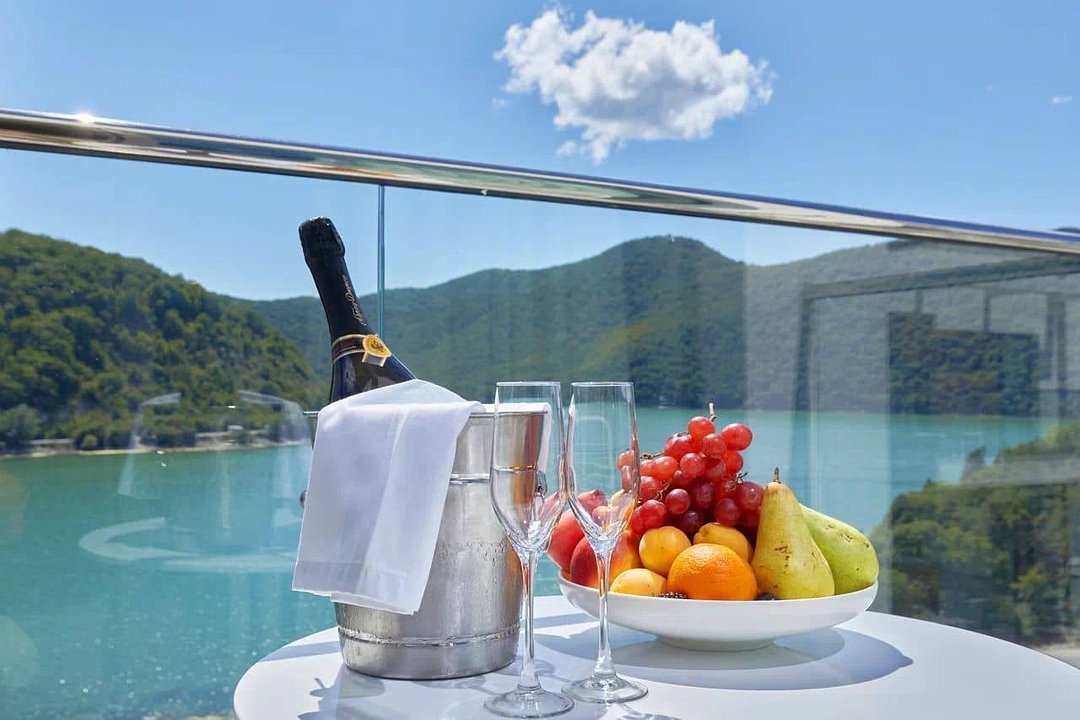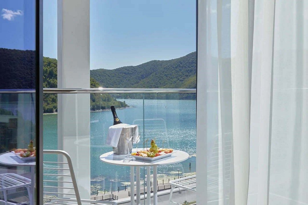 телевизор, Wi-Fi, настольные лампы, фен, электронные замки, душевая кабина, санузел, халаты, тапочки, терраса, две односпальные или большая двуспальная кровать, кресла, шкаф для одежды, вешалки, чайник, раковина, кресло, тумба, туалет, сплит-система, раскладное кресло, внутренний телефон, телевизор с плоским экраном, вид на озеро, вид на горы, кресло-кровать, бутилированная вода, шапочка для душа, мыло, без питомцевВ гостиничном номере