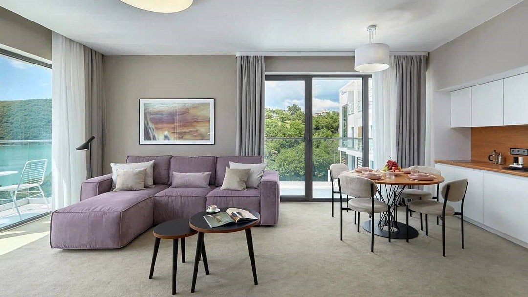 Просторный номер с визуальным разделением спальни и гостиной. Панорамные окна выходят на Абрау – самое большое озеро Краснодарского края и жемчужину курорта. Окружающую красоту и эстетику номера дополнят «умные технологии», которые сделают ваше проживание еще более безмятежным.Услуги и удобства