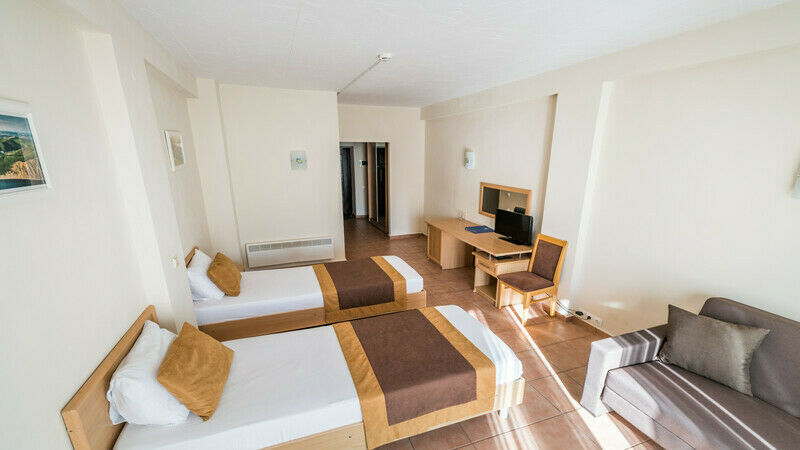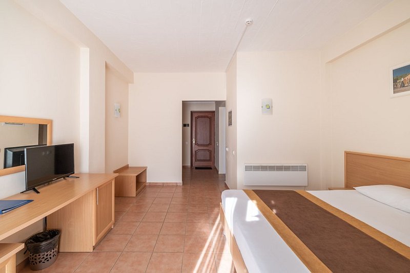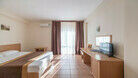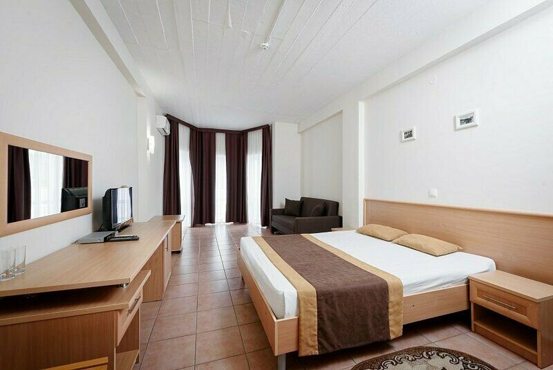 Номер Полулюкс около 20 м², двуспальная кровать и полутора-спальный диванчик в роли дополнительного места.