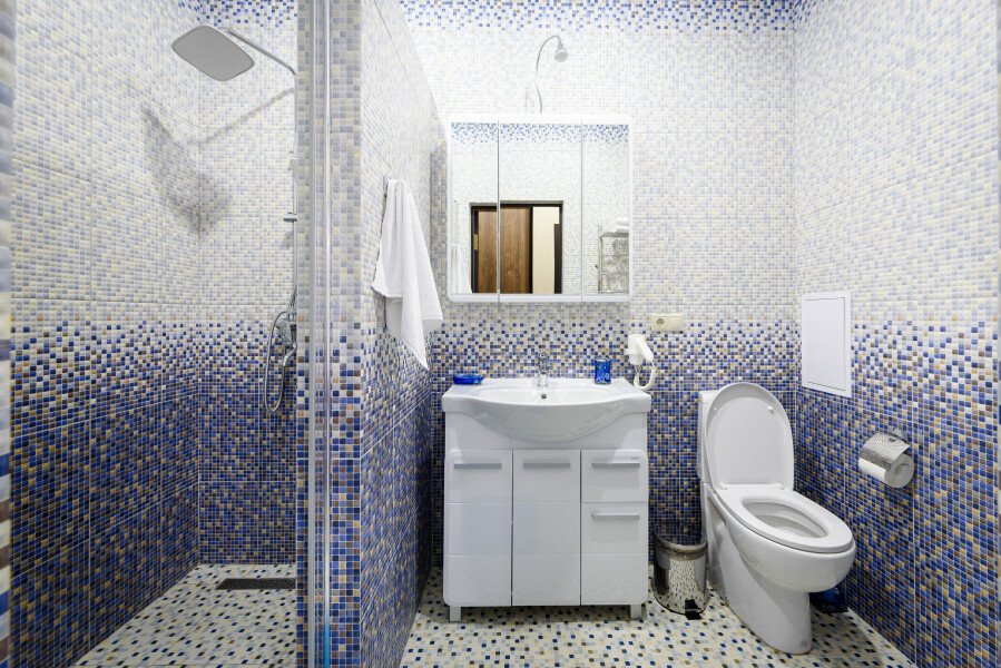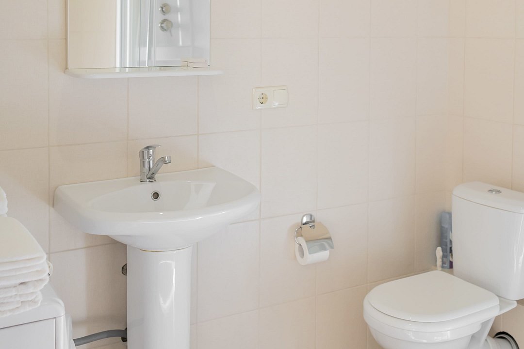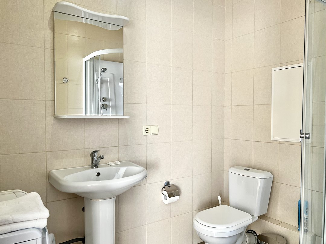 Две раздельные односпальные кровати во второй комнате. Санузел, душ, фен, тапочки, теплый пол, набор косметики и гигиенических принадлежностей.