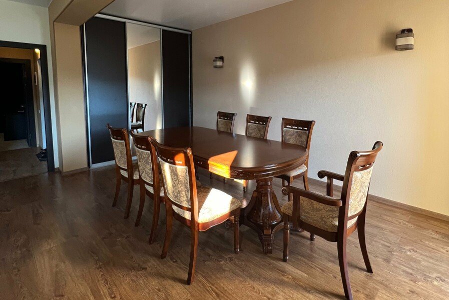 Во второй комнате — кухонный гарнитур с варочной панелью, чайник, посуда (тарелки, чашки, ложки, вилки, ножи, доска разделочная), стол, стулья, большой холодильник, стиральная машина. Санузел, душ, фен, тапочки, набор косметики и гигиенических принадлежностей.