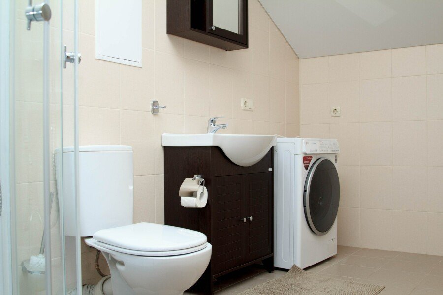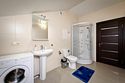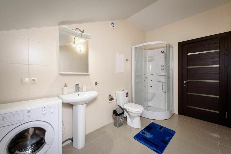 Кухонный гарнитур с варочной панелью, большой холодильник, стол для семейных обедов, чайник, посуда (тарелки, чашки, ложки, вилки, ножи, доска разделочная, кастрюля, сковорода). Санузел, душевая кабина, стиральная машина, тапочки. Фен предоставляется по запросу.