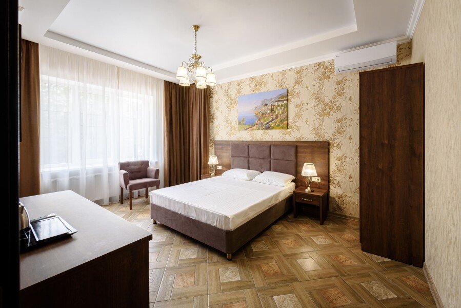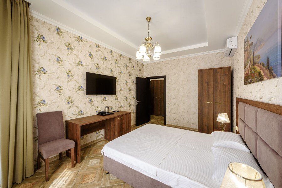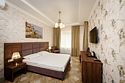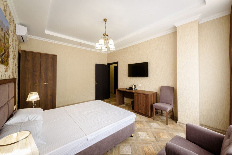 Двухкомнатный номер площадью тридцать пять квадратных метров на первом этаже главного корпуса с балконом для двух взрослых. В номере: двуспальная кровать размера «king size», шкаф для одежды, рабочий стол, кресло, мини-бар, чайник, чайная пара, кондиционер, москитные сетки, спутниковое TV, бесплатный Wi-Fi.