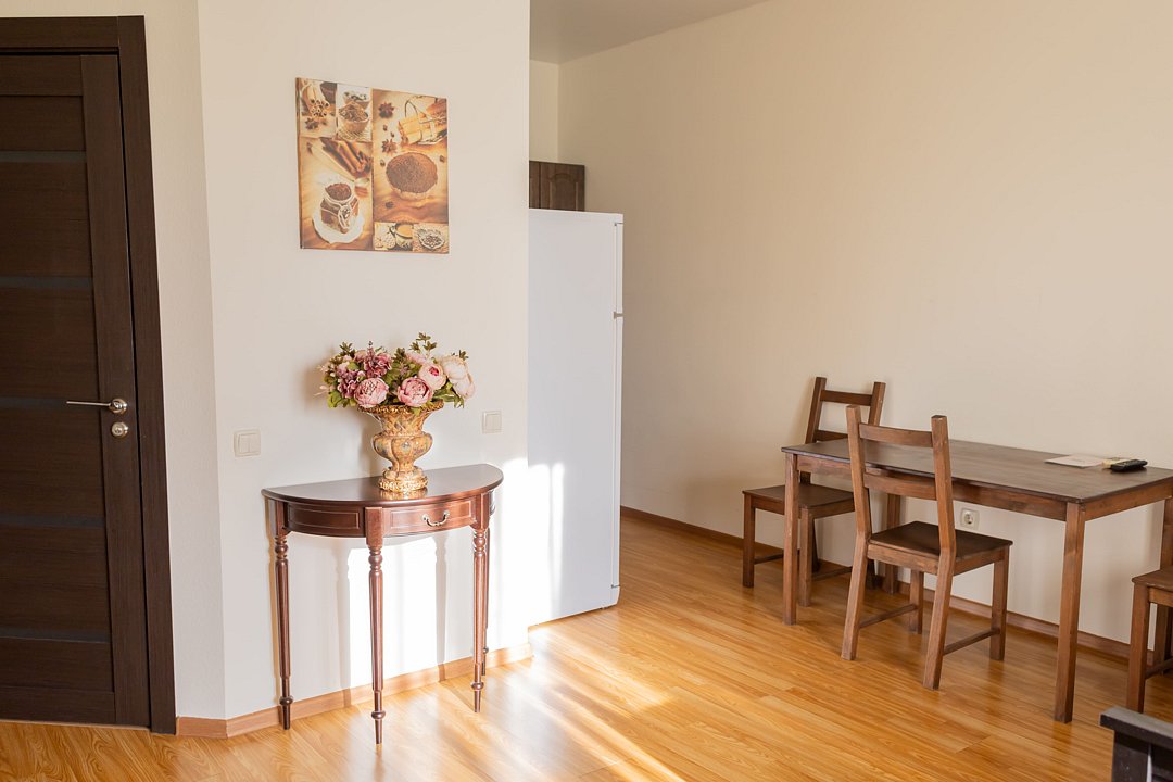 Номер площадью 26 м² на 1 этаже верхнего корпуса с видом на внутренний двор, вместимостью до 4 человек. Без балкона. В номере: 2 раздельные односпальные кровати, 2-ух местный раскладной диван, шкаф для одежды, кондиционер, москитные сетки, спутниковое TV, бесплатный wi-fi. Кухонный гарнитур с варочной панелью, холодильник, стол, 3 стула, чайник, посуда для 4 персон (тарелки, чашки, ложки, вилки, ножи, доска разделочная, кастрюля, сковорода). Санузел, душевая кабина, стиральная машина, тапочки, шампунь и гель для душа. Фен предоставляется по запросу. В стоимость проживания включено: пользование подогреваемым бассейном, пользование зонами отдыха и инфраструктурой Отеля, открытая парковка на территории Отеля, детская площадка, настольные и активные игры.