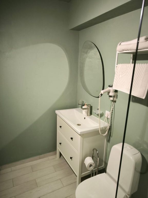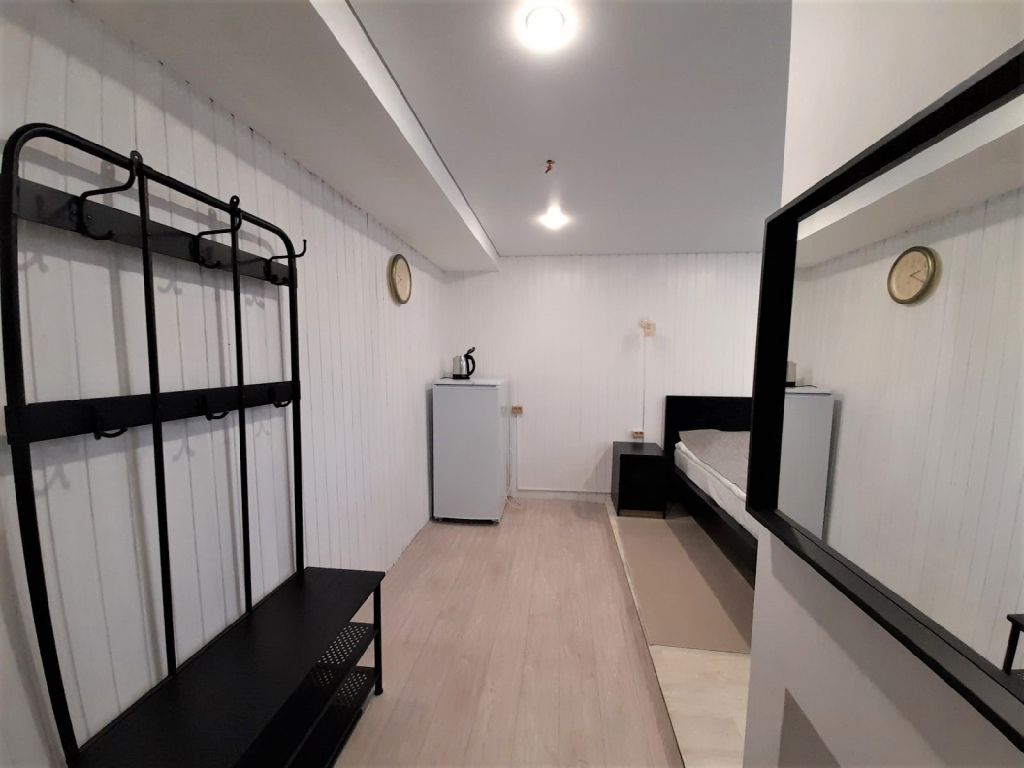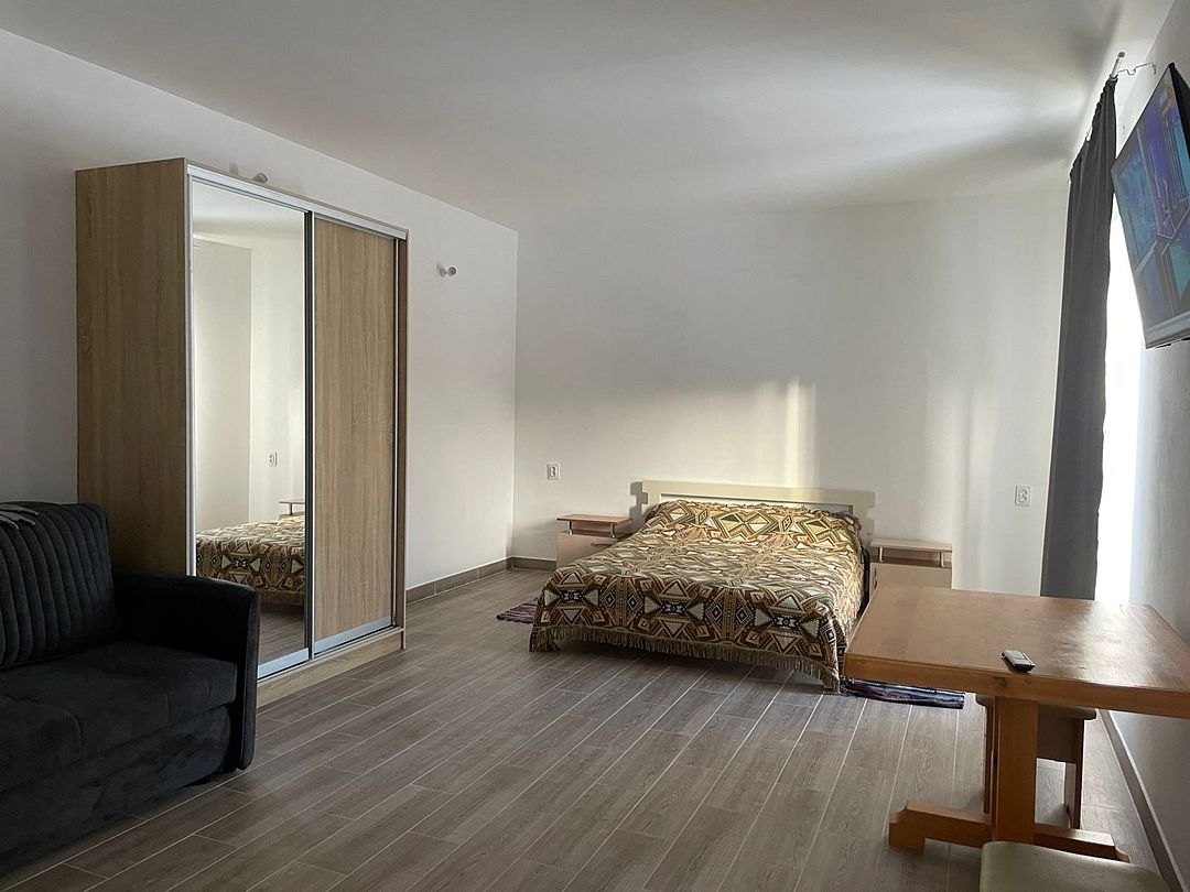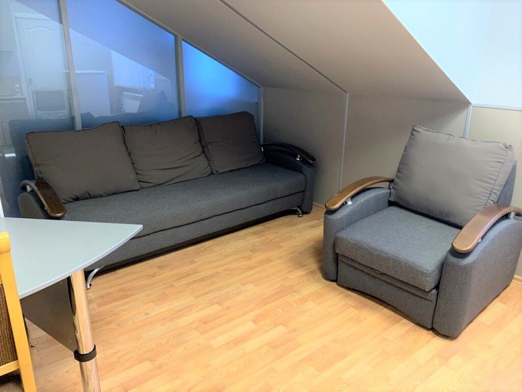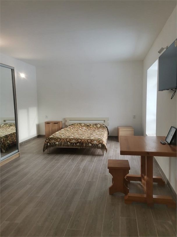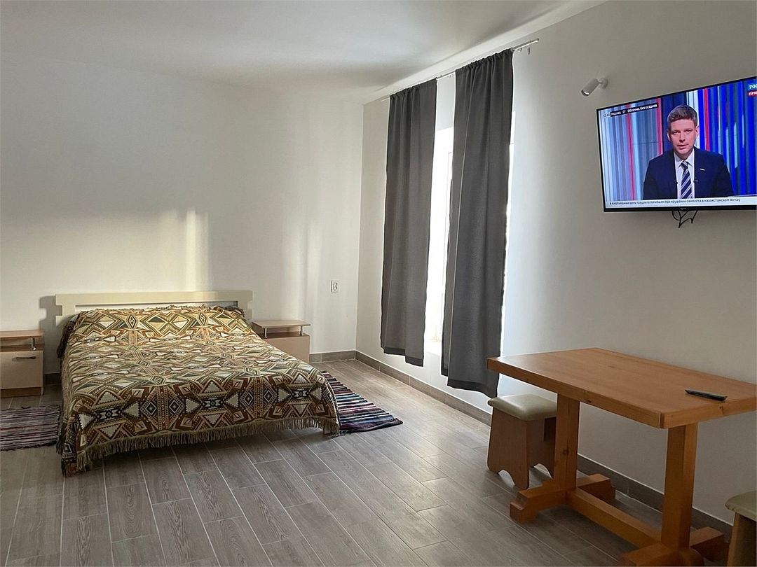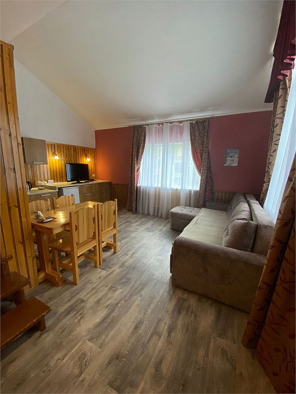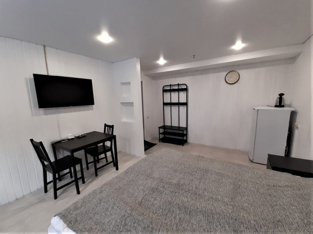 Однокомнатный номер на третьем этаже. Санузел с душевой кабиной находится на этаже, рядом с номером. В номере: двухместный раскладной диван, стол со стульями, ТВ, кухонная зона с чайником, микроволновкой, холодильником, чайными принадлежностями.
