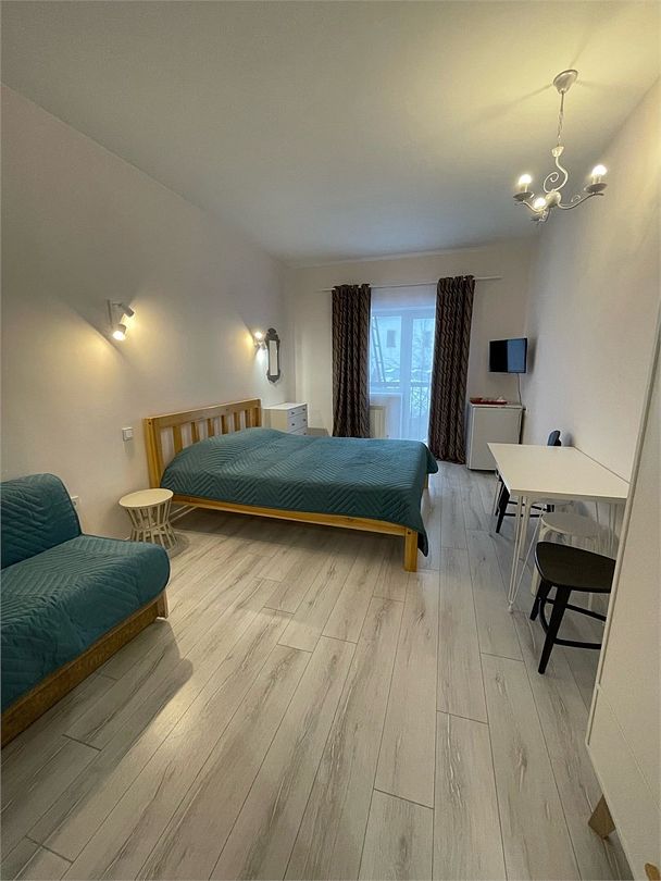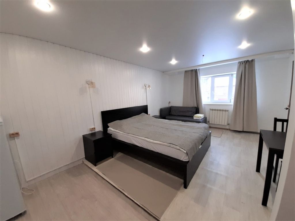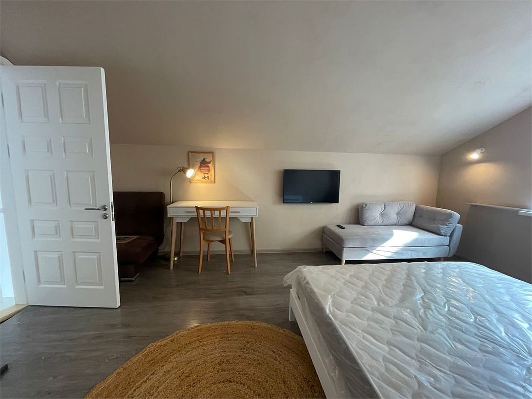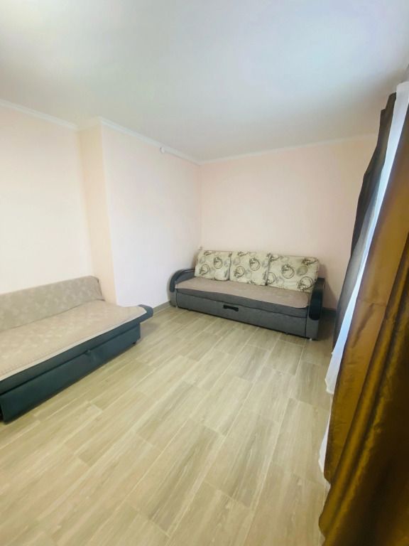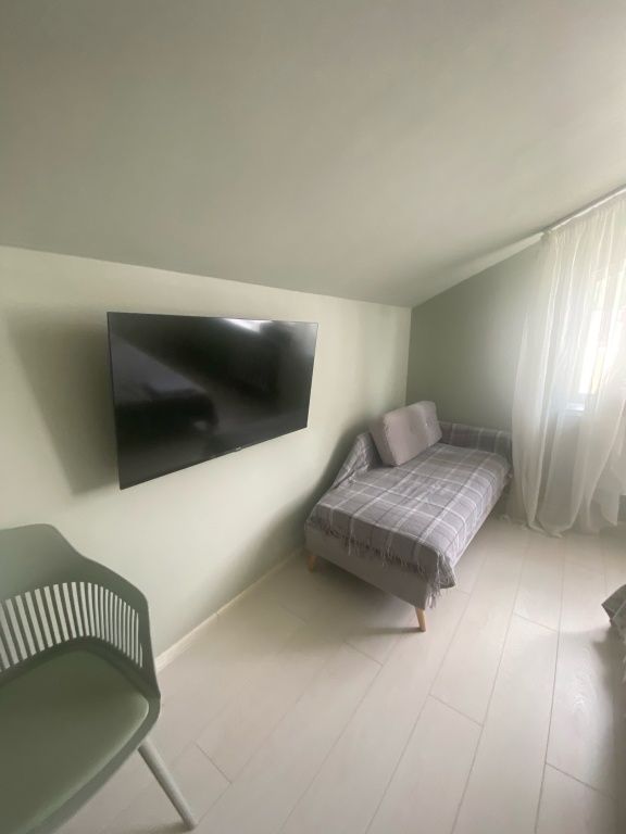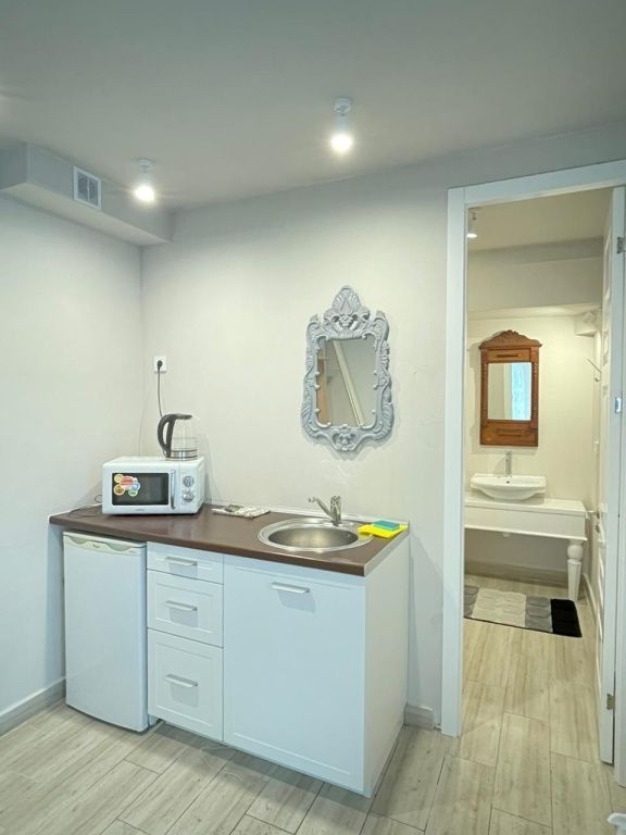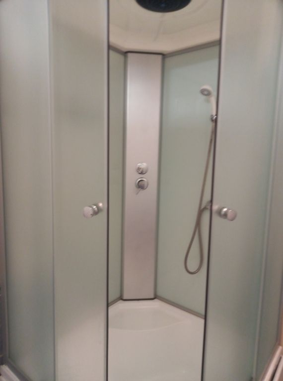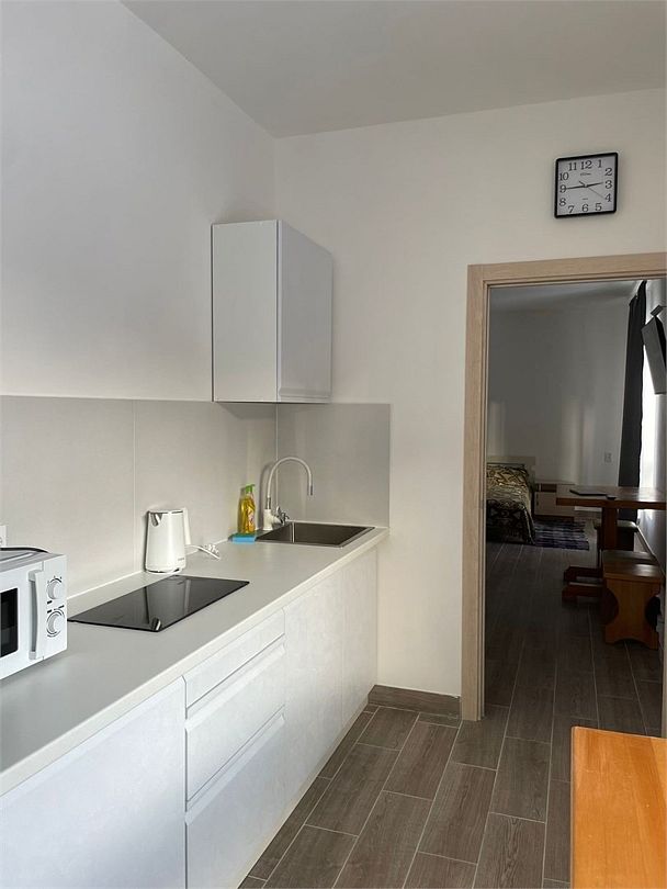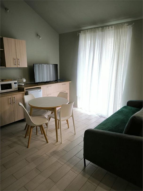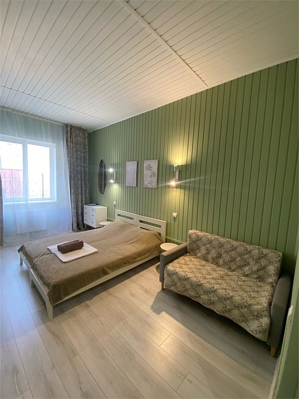 Однокомнатный номер на третьем этаже. Санузел с душевой кабиной находится на этаже, рядом с номером. В номере: двухместный раскладной диван, стол со стульями, ТВ, кухонная зона с чайником, микроволновкой, холодильником, чайными принадлежностями.