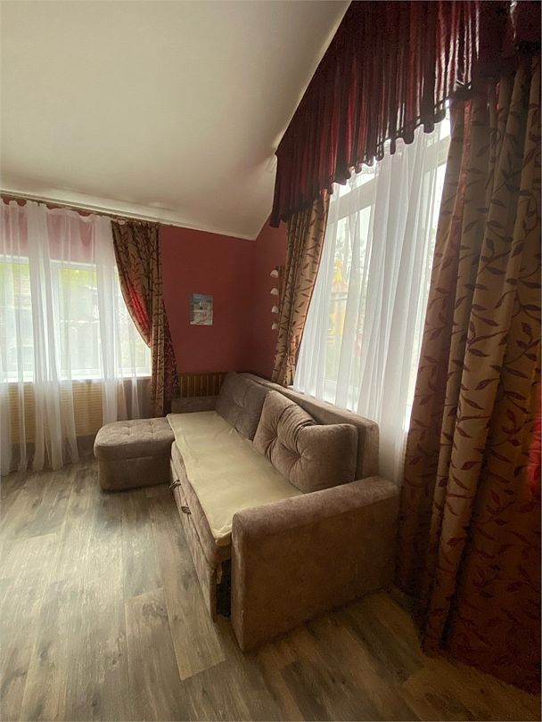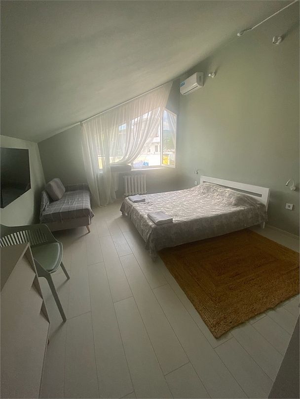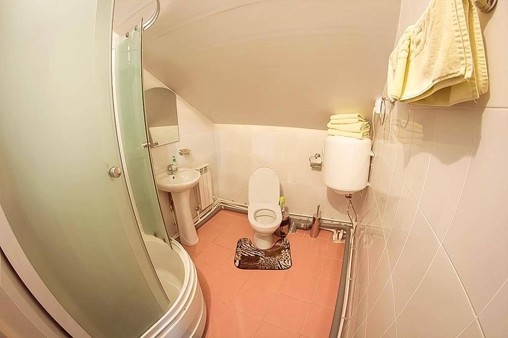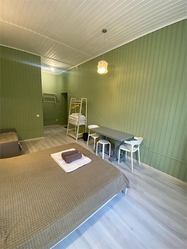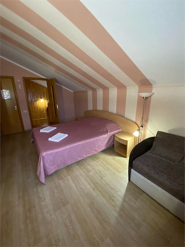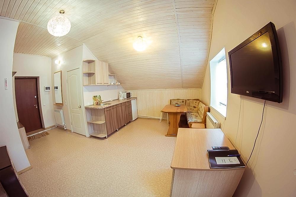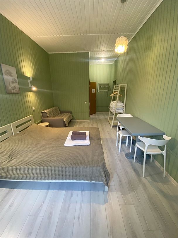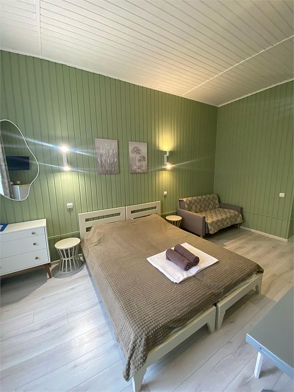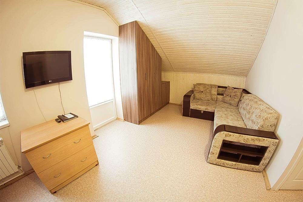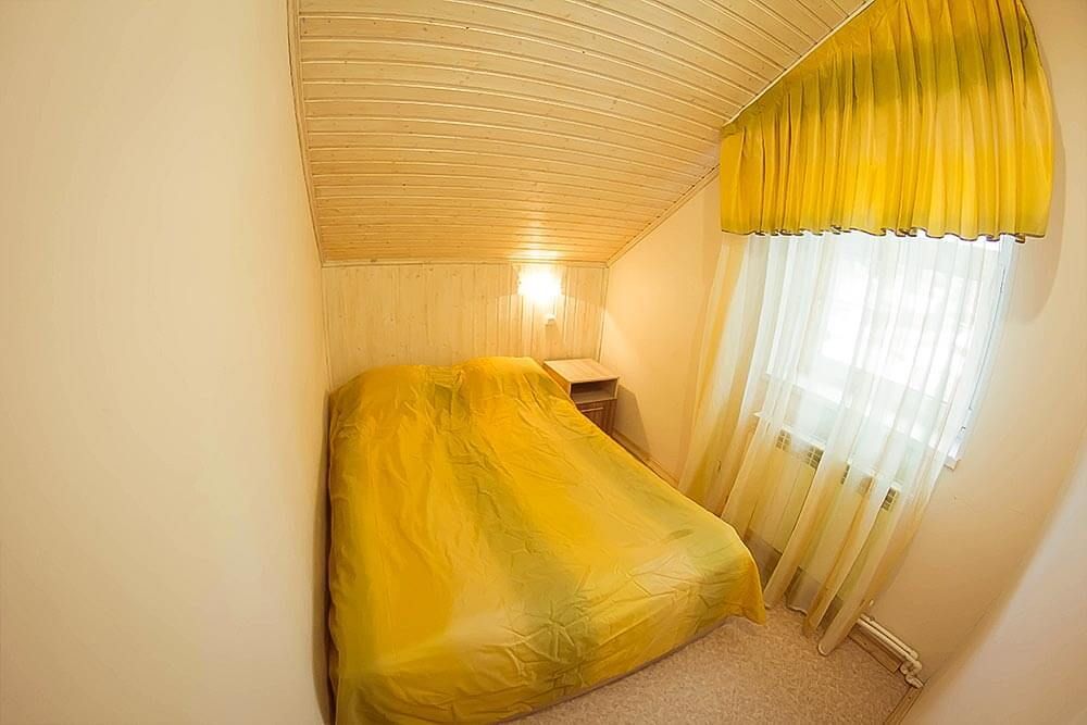 Однокомнатный номер. Находится над сауной. Площадь 20 м². В номере: двуспальная кровать + диванчик, который раскладывается, стол, холодильник, чайник. Санузел и душевая кабина.