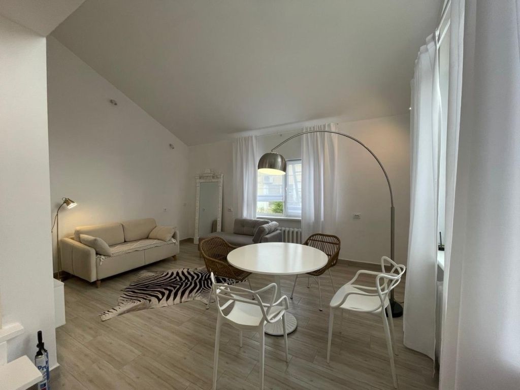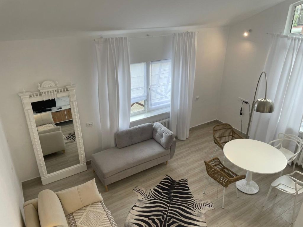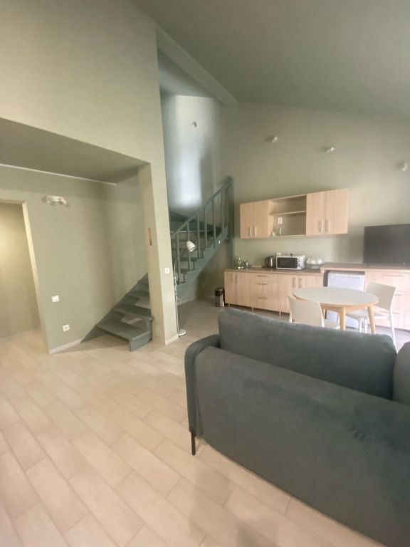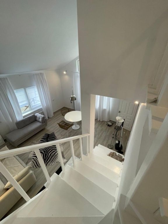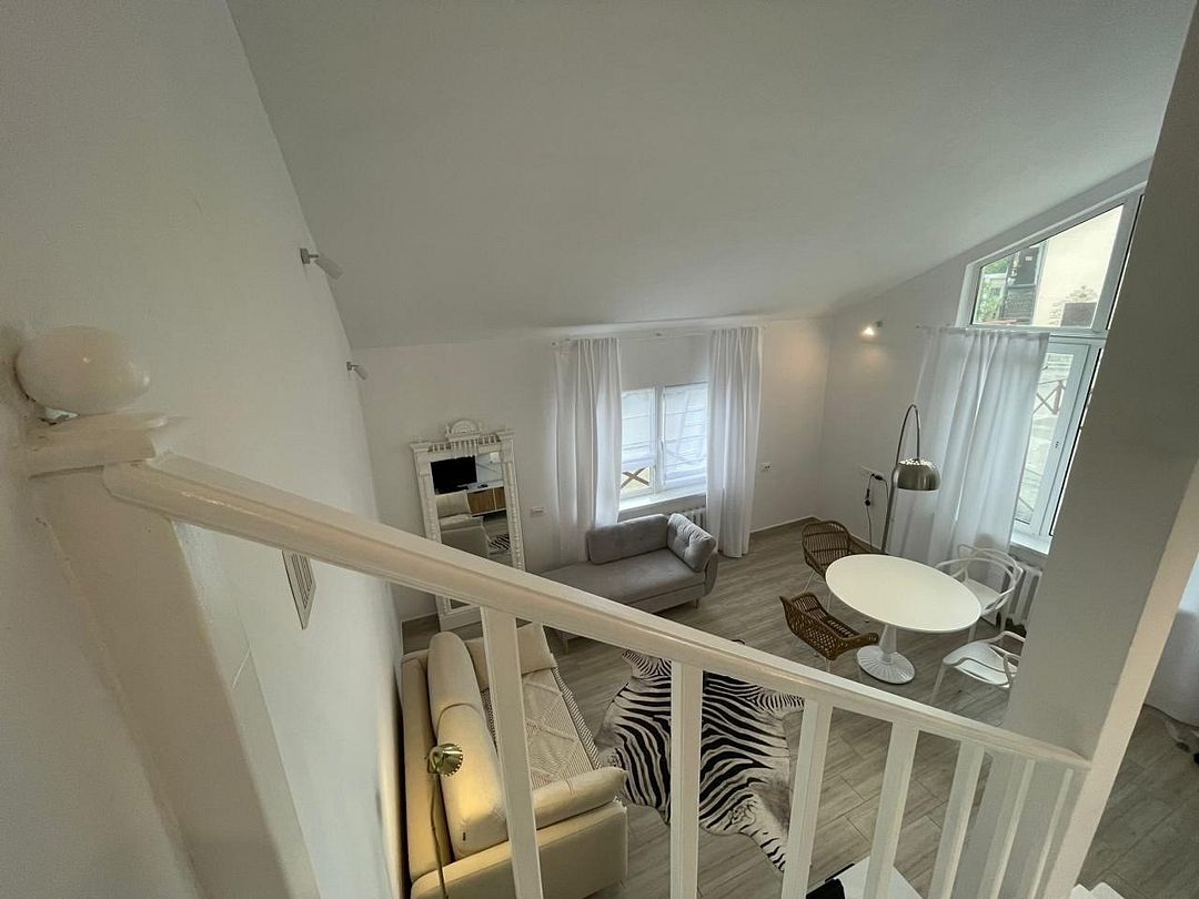 Обновленный двухэтажный номер в светлых тонах с индивидуальным входом с улицы. На первом этаже находятся прихожая, кухня, санитарный узел с душем и гостиная, в которой располагаются два уютных дивана, телевизор, холодильник, микроволновая печь, чайник и посуда. Также имеется телефон для внутренней связи с администратором отеля.