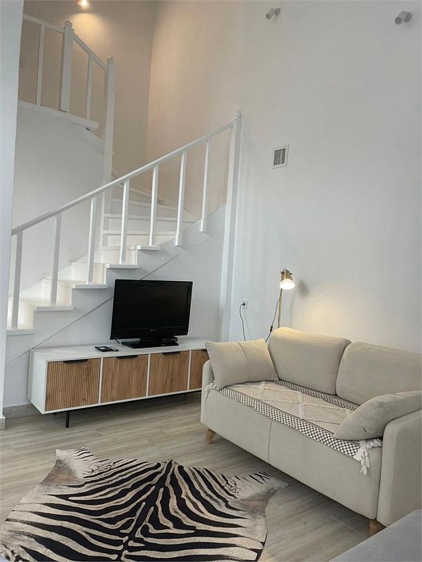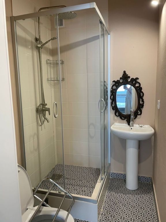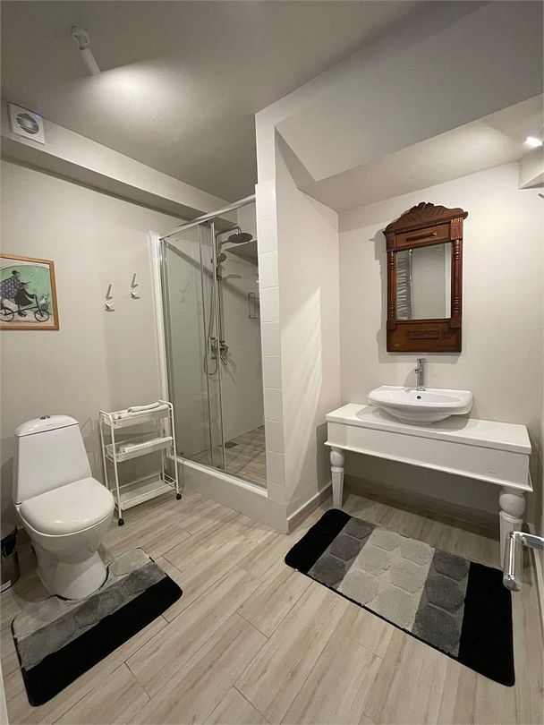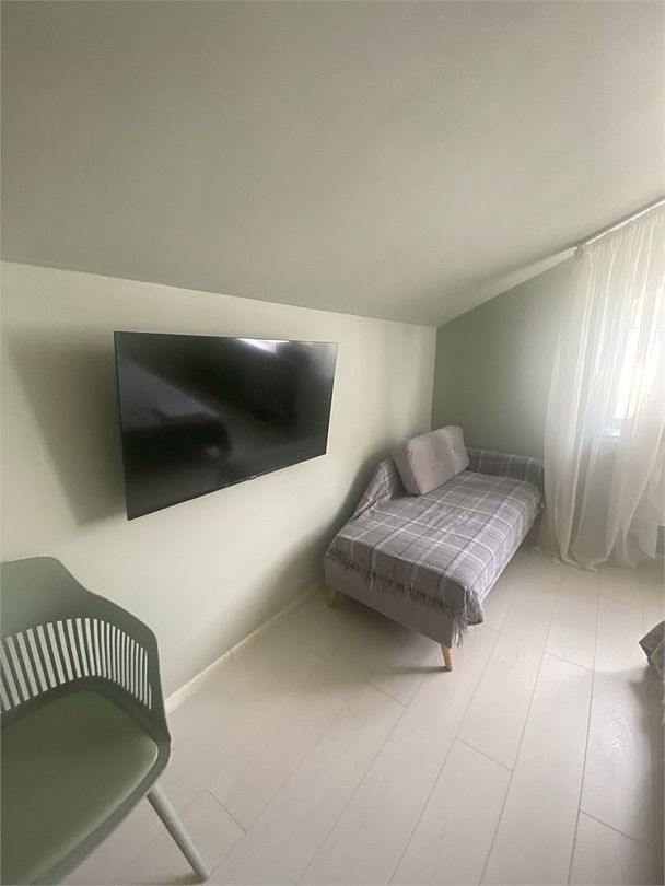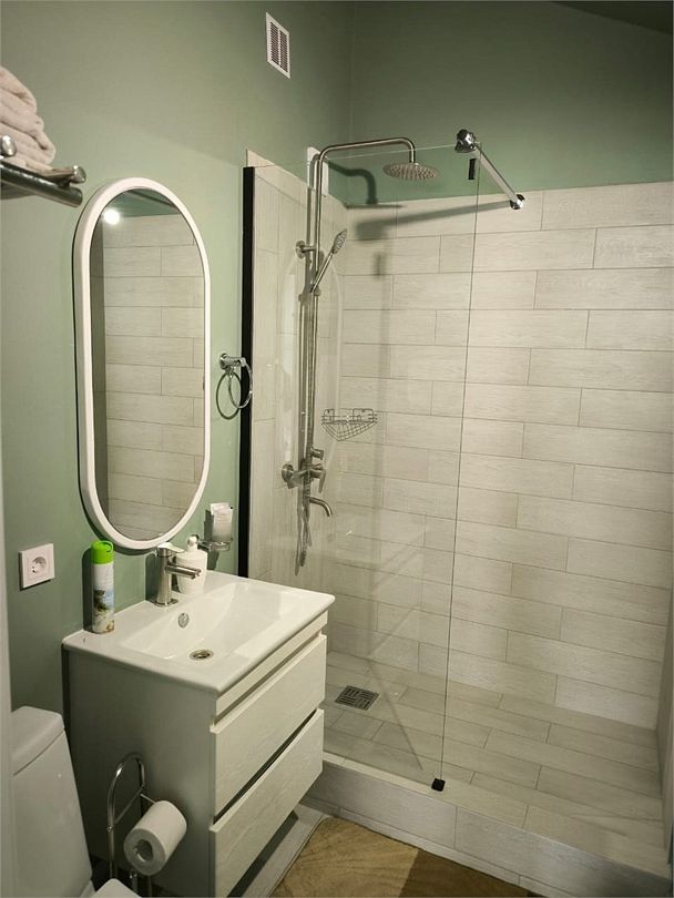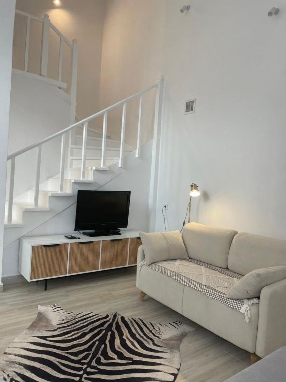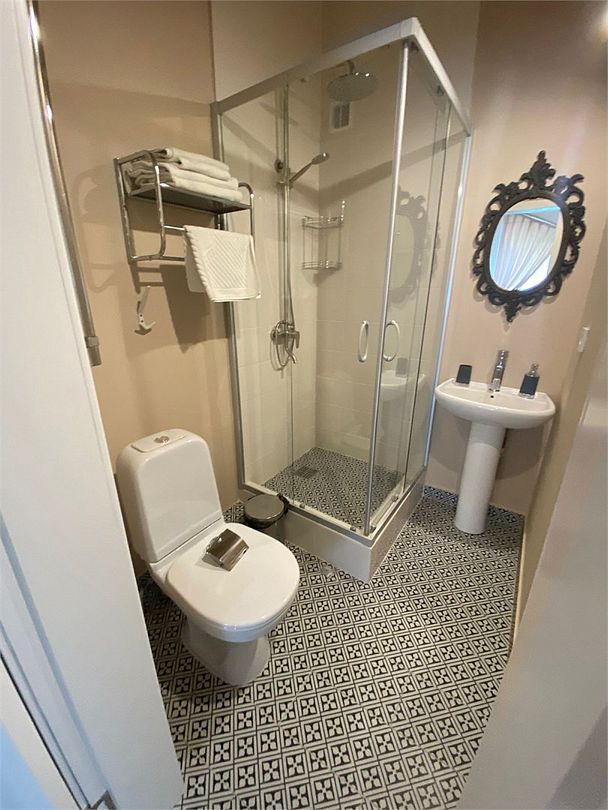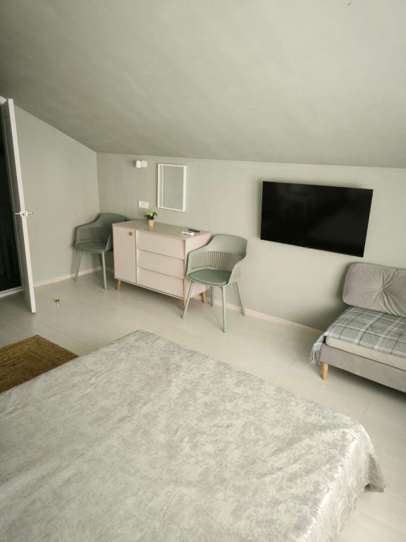 Обновленный номер с отдельным входом! На первом этаже: прихожая, санузел с душем, гостиная с кухонной зоной (диван, телевизор, холодильник, СВЧ-печь, чайник, посуда).