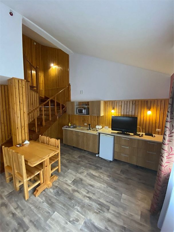 Номер расположен на 3-м этаже. Гостиная, совмещенная с кухонной зоной (телевизор, холодильник, СВЧ-печь, чайник, посуда). Спальня: двуспальная кровать, телевизор, шкаф-купе, туалетный столик, кресло. Санузел: душевая кабина, биде, туалетный столик, фен.