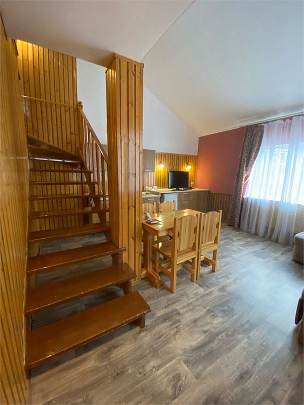 На втором этаже: спальня (двуспальная кровать, диванчик-полуторка, телевизор, шкаф), санузел с душем, фен. Для гостей этого номера предусмотрены банные халаты, тапочки, чай, сахар, Wi-Fi, кабельное телевидение, теплый пол.