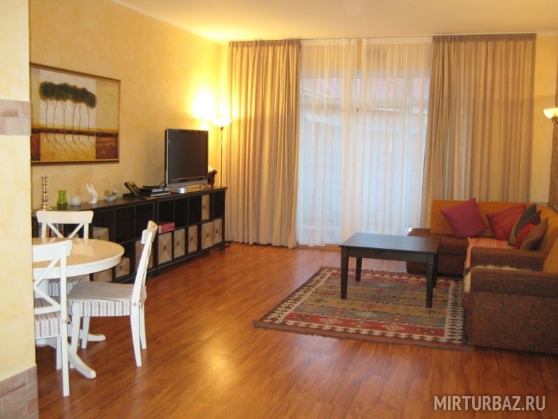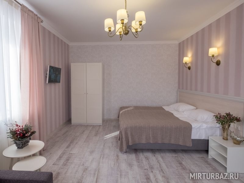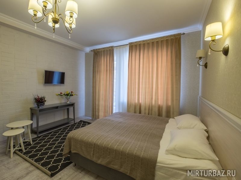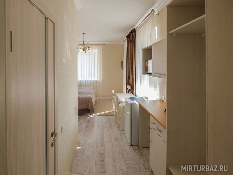 В номере: большая комната со встроенной кухонной зоной (микроволновая печь, электрический чайник, посуда), двуспальная кровать, балкон, ванная комната (душ, санузел, фен, космет. набор). ЖК-телевизор, сейф, телефон, холодильник, диван, кресла, журнальный столик.
