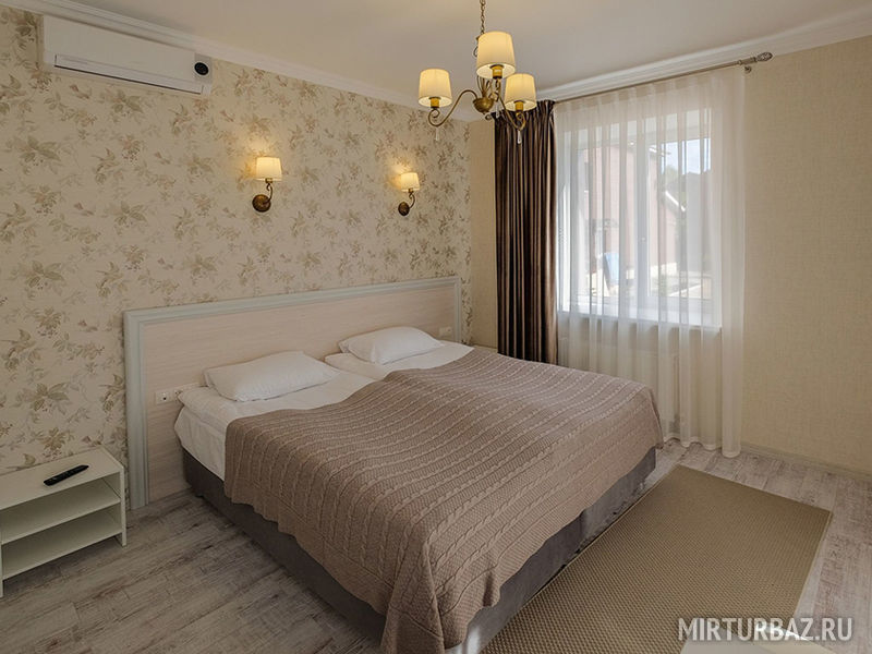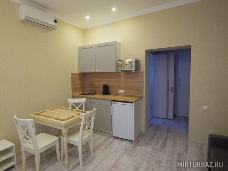 В номере: большая комната со встроенной кухонной зоной (микроволновая печь, электрический чайник, посуда), две односпальные кровати, ванная комната (душ, санузел, фен, космет. набор). ЖК-телевизор, сейф, холодильник, кондиционер, диван, журнальный столик, обеденный стол.
