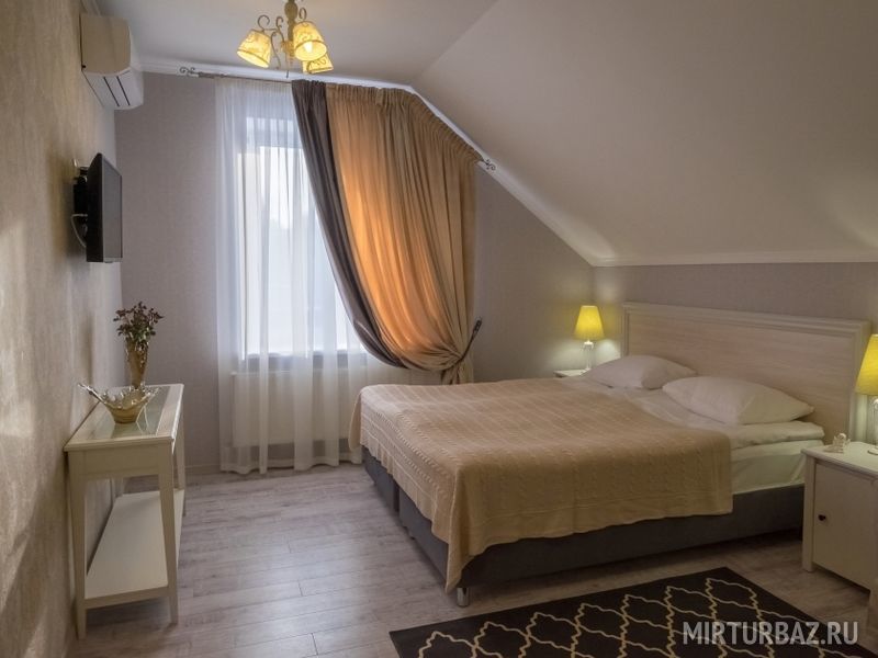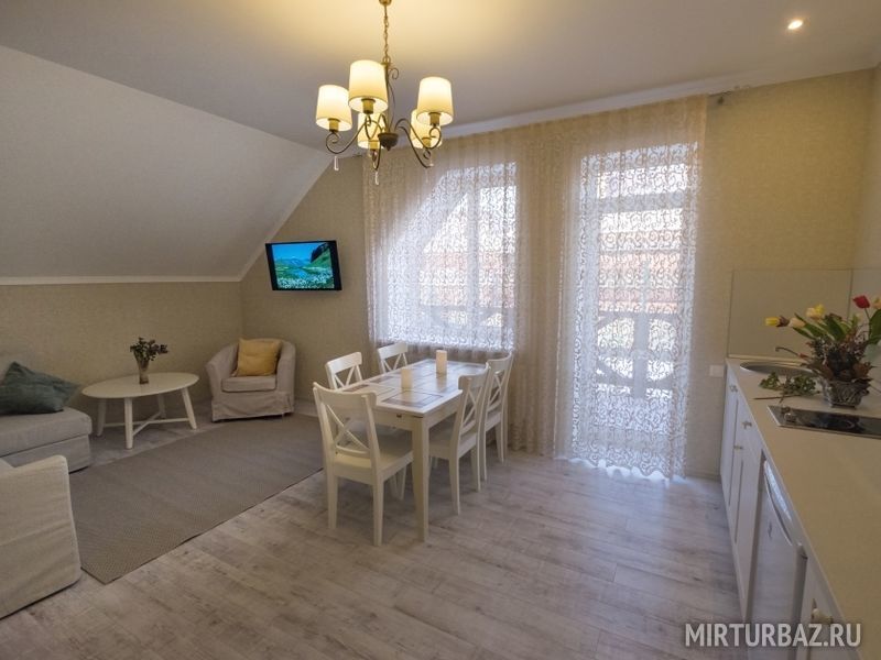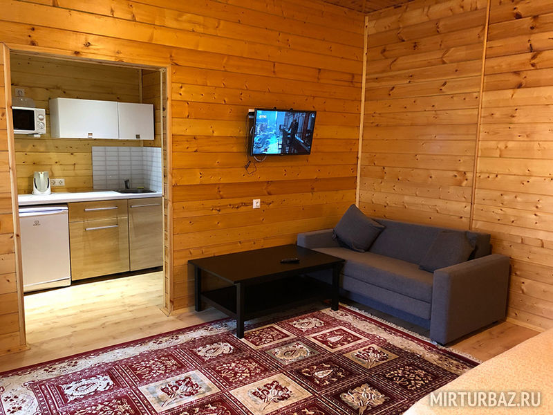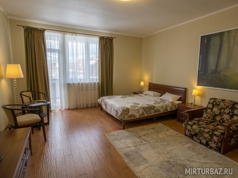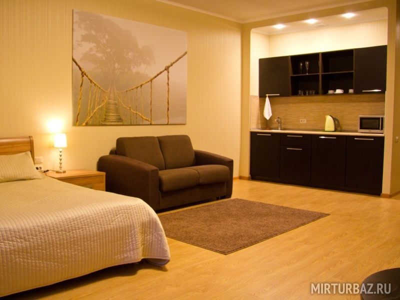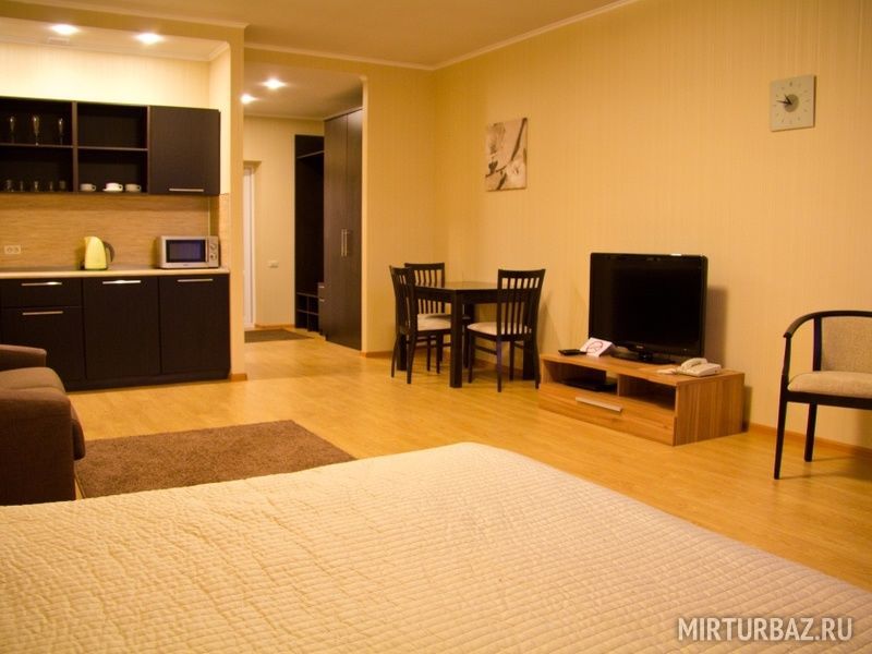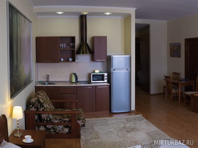 В номере: большая комната со встроенной кухонной зоной (микроволновая печь, электрический чайник, посуда, электроплита), двуспальная кровать, балкон, ванная комната (душевая кабина, санузел, фен, космет. набор, халаты, тапочки), инфракрасная сауна. ЖК-телевизор, сейф, телефон, холодильник, диван, кресла, журнальный столик.