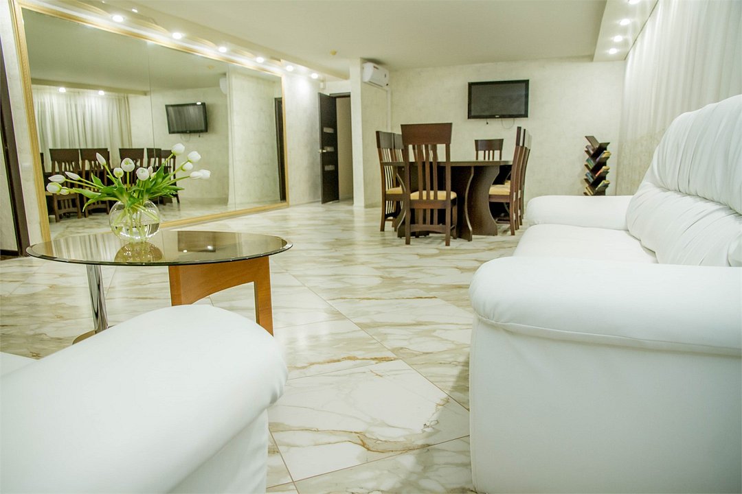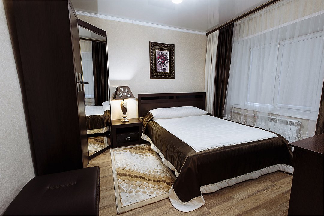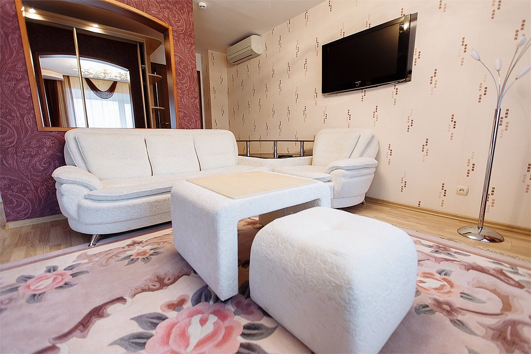 Wi-Fi, телефон, кондиционер, светильник, настольные лампы, фен, ванная комната, ванна, халаты, банные полотенца, тапочки, косметические средства, двуспальная кровать, ортопедический матрас, шкаф для одежды, вешалки, багажная тумба, зеркало, ковер, мебельный гарнитур, две комнаты, набор посуды, обслуживание номеров, сейф, унитаз, раковина, косметическое зеркало, питьевая вода, гостиная зона, отопление, вид на город, кулер на этаже, кресло, вид во двор, стаканы, столовые приборы, стул, туалетные средства, туалет, цифровое тв, раскладной диван, телевизор с плоским экраном, мини-холодильник, москитная сетка, номер для некурящих, пуфик, рабочий столВ номере