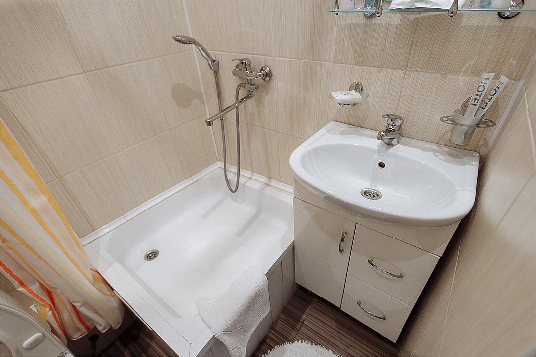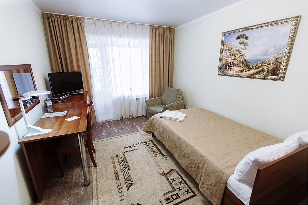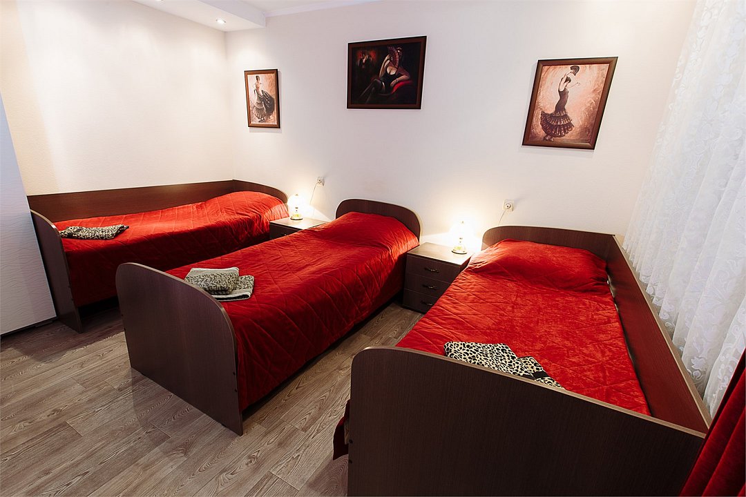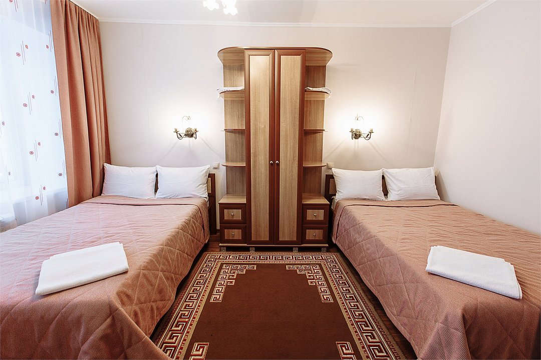 Уютный стандартный бюджетный номер для трёх человек. Расположен на первом этаже с видом на тихий внутренний дворик гостиничного комплекса.Услуги и удобства