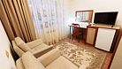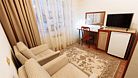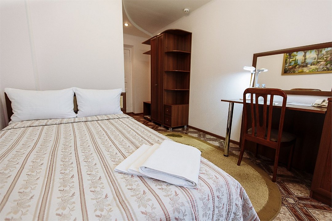 Уютный двухкомнатный стандартный номер разделён на гостиную и спальную зоны для размещения двух человек. В номере в спальной зоне две большие полутороспальные кровати, шкаф. В гостиной два мягких кресла,рабочая зона. Номер с видом на тихий гостиничный дворик.Услуги и удобства