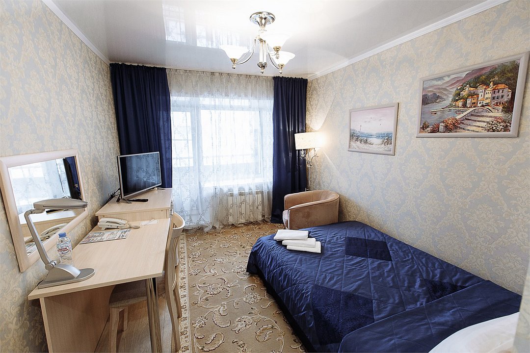 Wi-Fi, телефон, кондиционер, светильник, настольные лампы, фен, халаты, банные полотенца, тапочки, косметические средства, балкон, полутораспальная кровать, ортопедический матрас, шкаф для одежды, вешалки, багажная тумба, зеркало, ковер, набор посуды, обслуживание номеров, унитаз, раковина, питьевая вода, отопление, душ, вид на город, кулер на этаже, кресло, вид во двор, стаканы, столовые приборы, стул, туалетные средства, туалет, цифровое тв, телевизор с плоским экраном, мини-холодильник, рабочий столВ номере