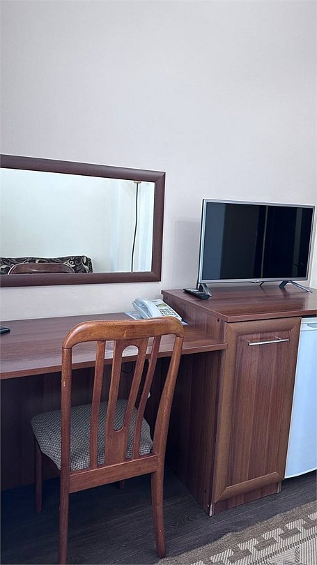 Wi-Fi, телефон, холодильник, кондиционер, светильник, фен, обогреватель, ванная комната, халаты, банные полотенца, тапочки, гигиенические средства, балкон, двуспальная кровать, шкаф для одежды, вешалки, багажная тумба, зеркало, ковер, унитаз, раковина, отопление, вид на город, кулер на этаже, кресло, кухонная посуда, стаканы, столовые приборы, стул, туалетные средства, туалет, внутренний телефон, телевизор с плоским экраном, москитная сетка, гостиничная парфюмерия, рабочий стол, уборка номера, вешалки-плечики, мылоВ гостиничном номере