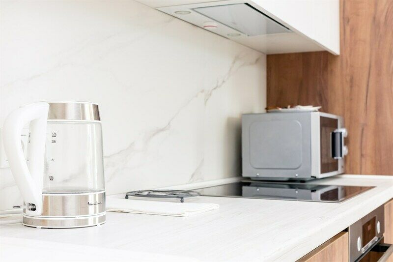 Для работы и развлечений высокоскоростной интернет с Wi-Fi и многоканальное кабельное TV Кухня полностью укомплектована посудой и бытовой техникой: набор посуды, бокалы под вино и шампанское, питьевая бутилированная вода, чай, кофе и шоколад, варочная поверхность, микроволновая печь, электрический духовой шкаф, электрочайник, гейзер для приготовления кофе, холодильник, подсолнечное масло.