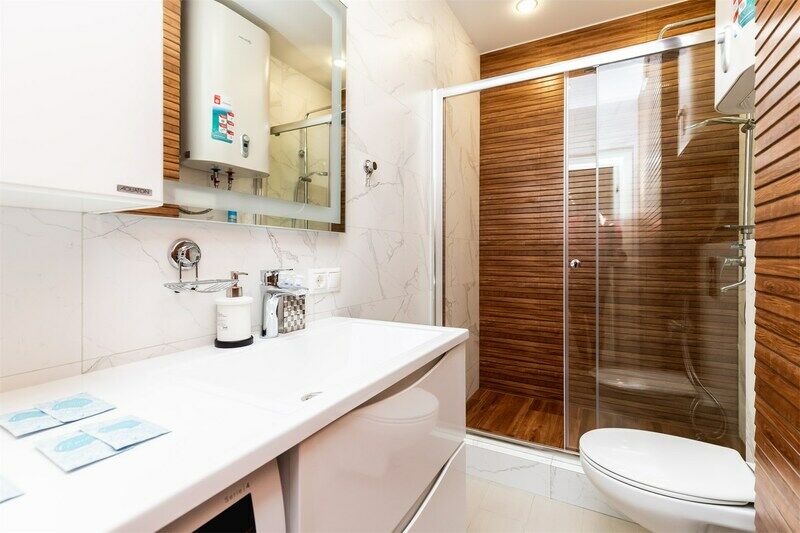 В ванной комнате: душ, гигиенические и косметические принадлежности, стиральная машина, средство для стирки белья, водонагреватель, фен.