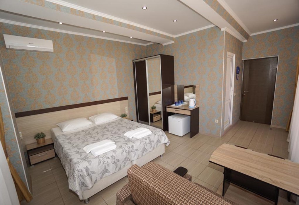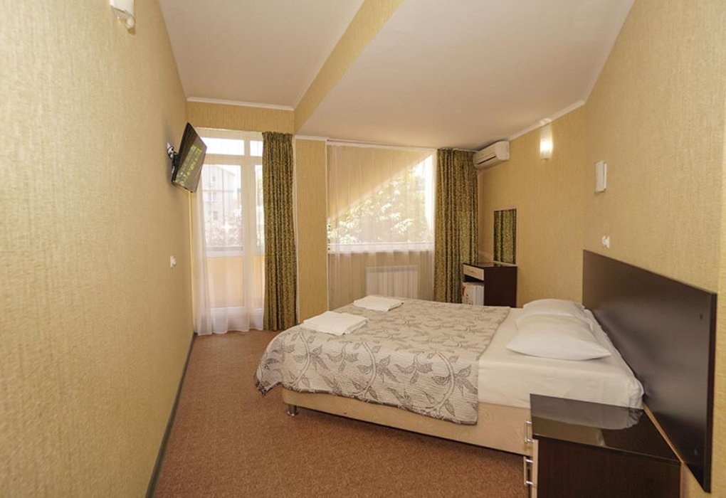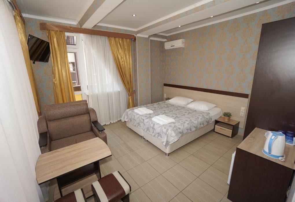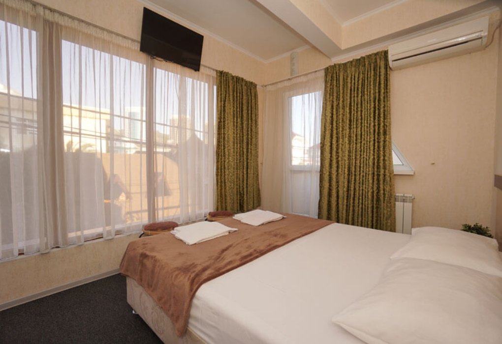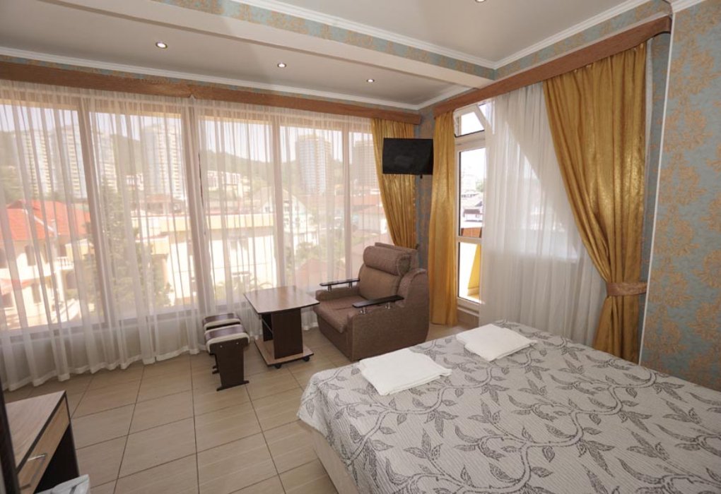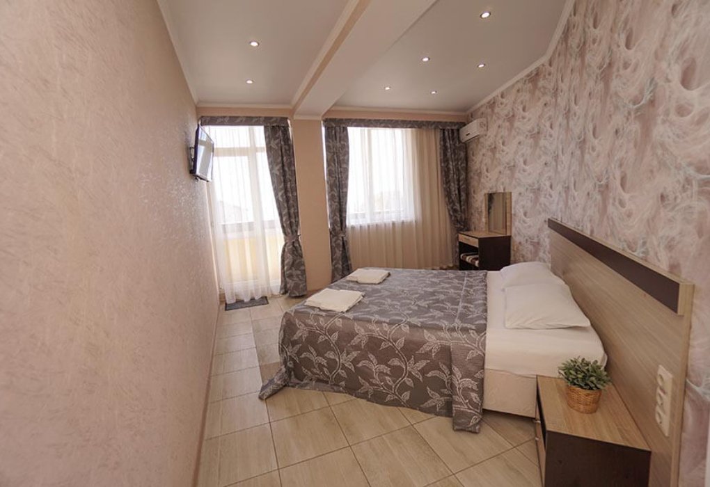 Комфортабельные номера, в светлых тонах, оборудованы необходимой техникой и собственной ванной комнатой. Размещение подойдёт для всей семьи. С балконов открывается вид на побережье и город.