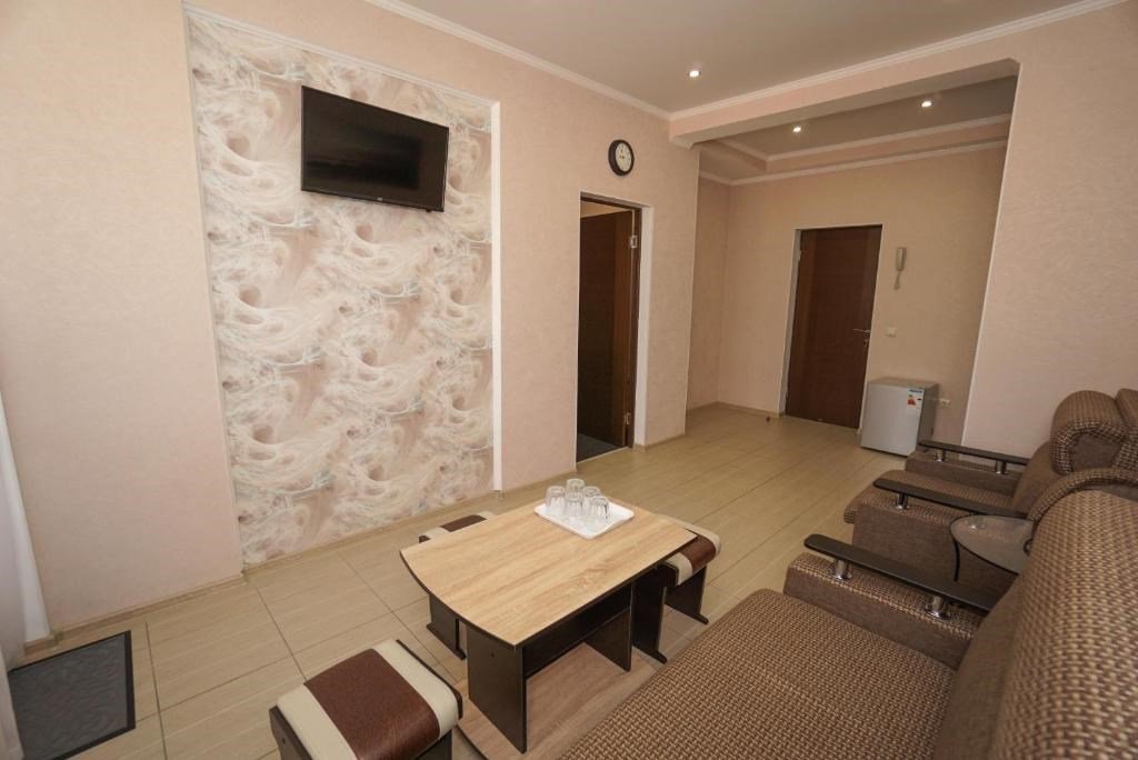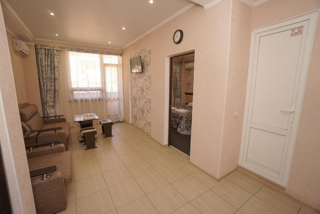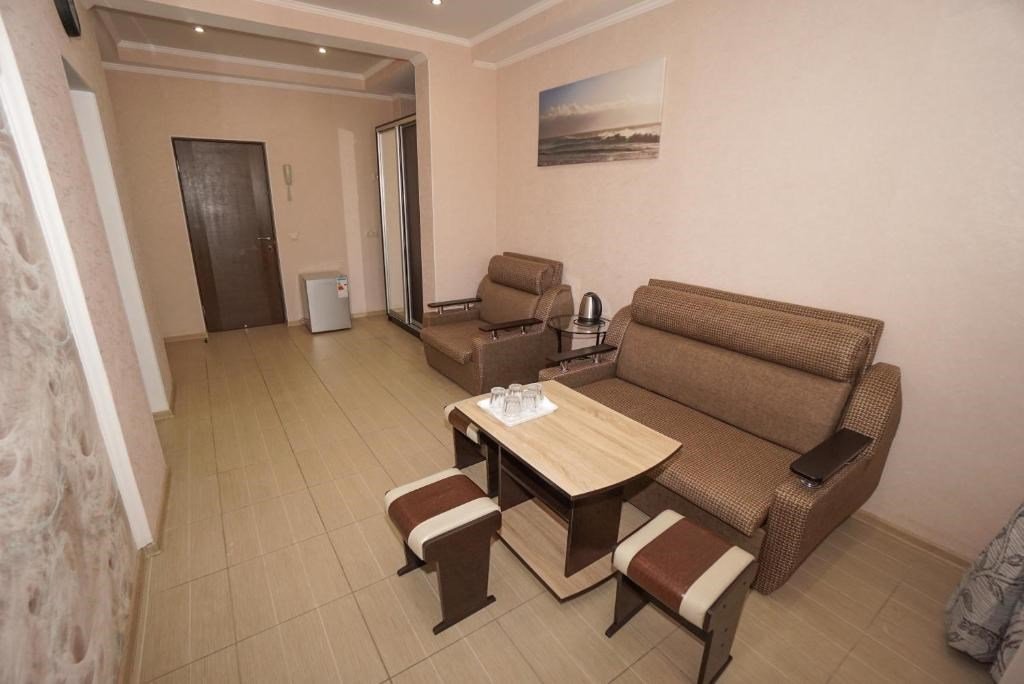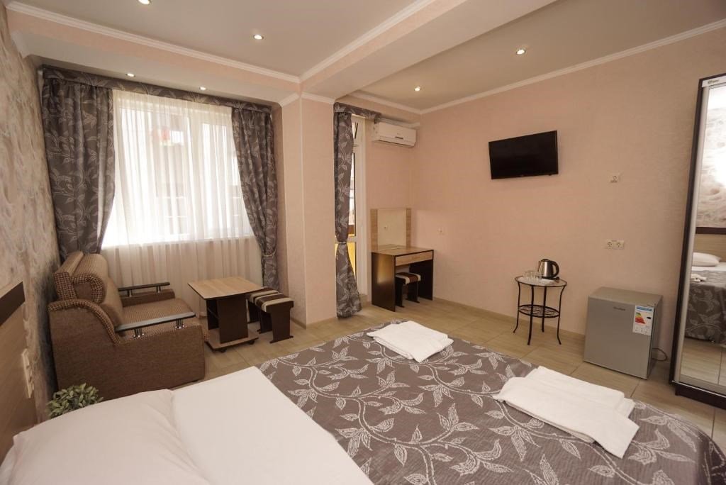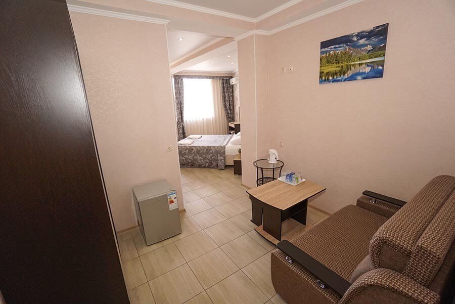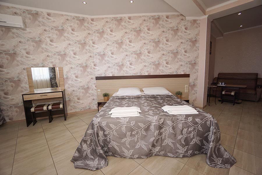 40 кв. м, 2 телевизора, Wi-Fi, 2 кондиционера, душ, умывальник, холодильник, 2 балкона, журнальный стол, 1 диван-кровать, 1 кресло-кровать и 1 большая двуспальная кровать, чайник, туалет, сушилка для одежды, ковровое и плиточное покрытие. Доп. место - раскладной диван, установлен без ограничения по возрасту.Услуги и удобства