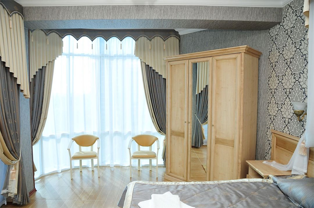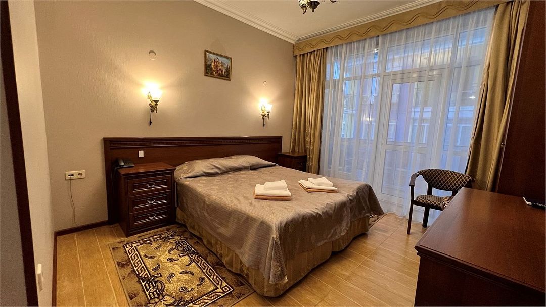 Двухкомнатный номер с балконом. Спальная комната: французская кровать с балдахином, прикроватными тумбочками, туалетный столик, телевизор. Гостиная: два кресла, шкаф, журнальный столик, тумба под телевизор и холодильник. Ванная комната оснащена комфортабельной душевой кабиной, фен, халаты, тапочки.Услуги и удобства