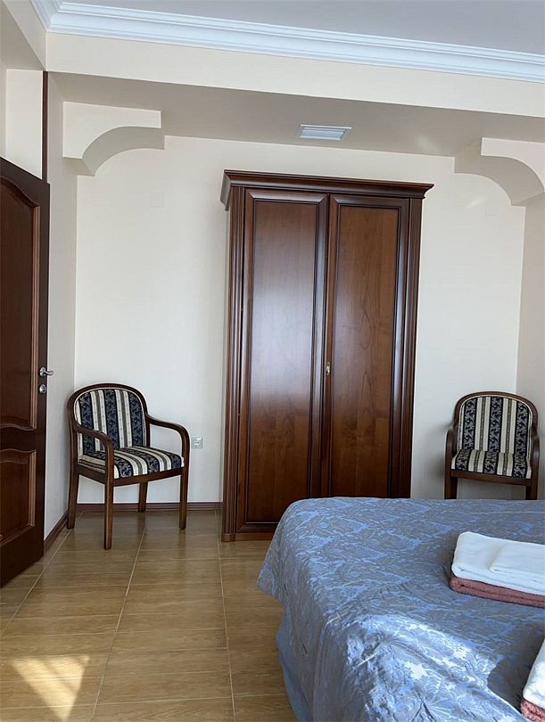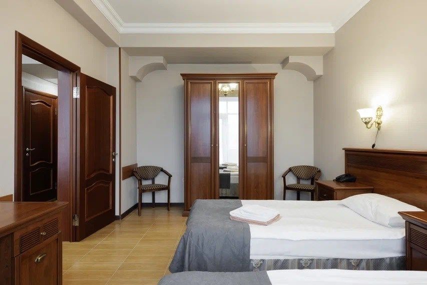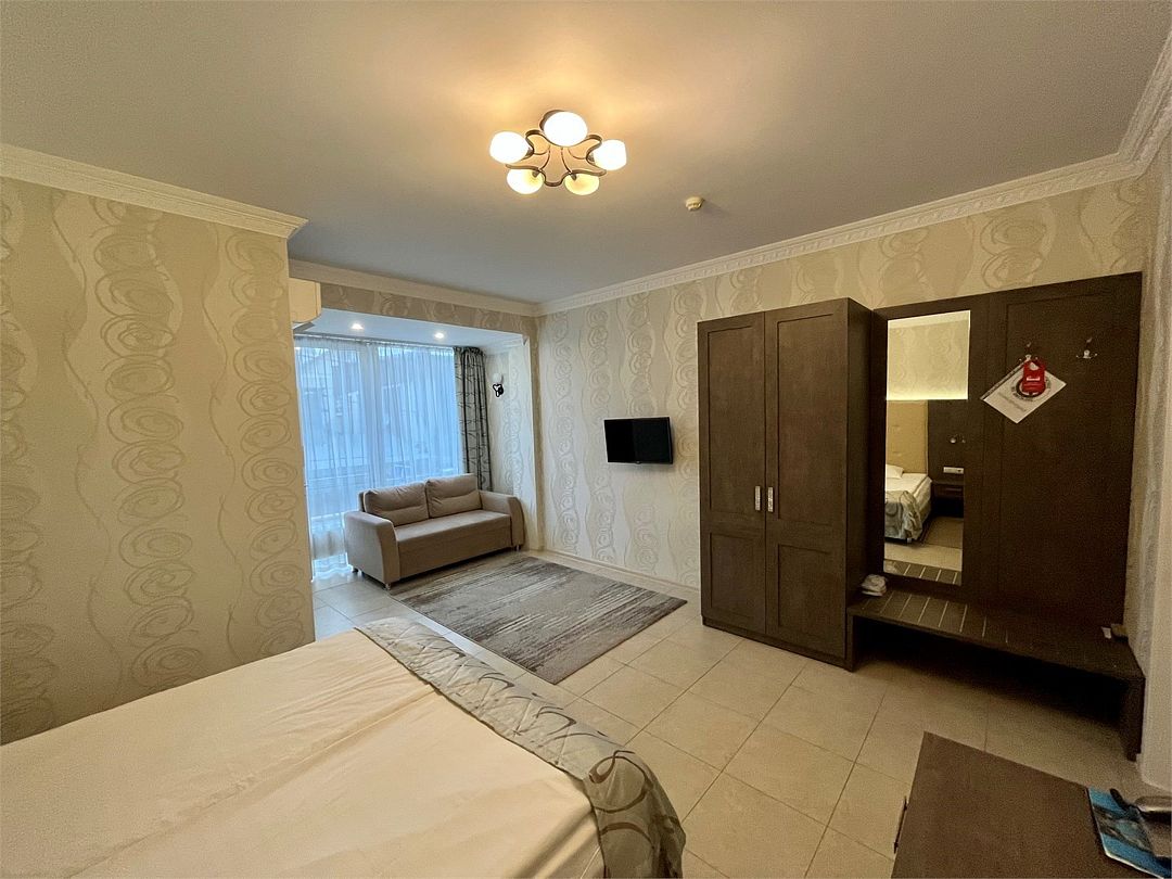 Трехместный, однокомнатный номер без балкона, двуспальная кровать с прикроватными тумбочками, диван-кровать, шкаф, журнальный столик, туалетный столик, телевизор, холодильник. Ванна, санузел, раковина, банные полотенца, фен, банная косметика.Услуги и удобства