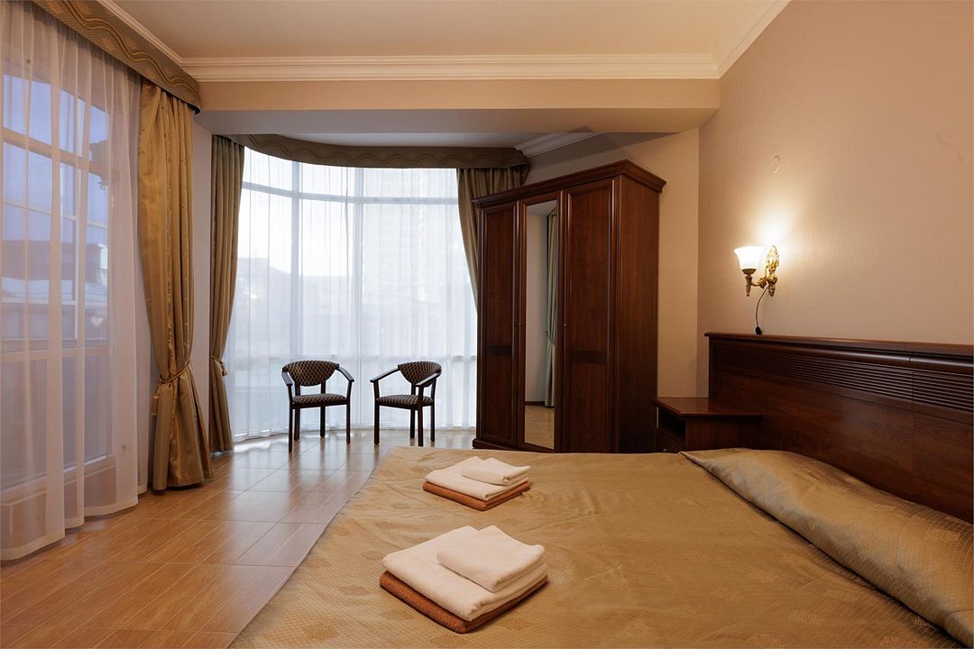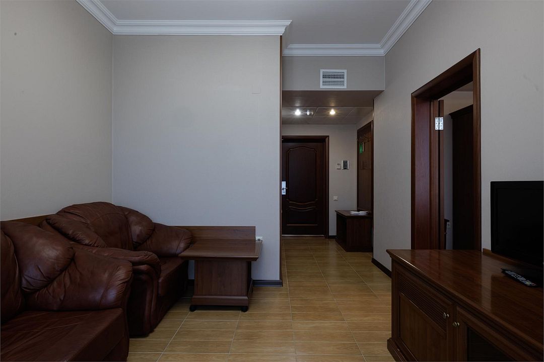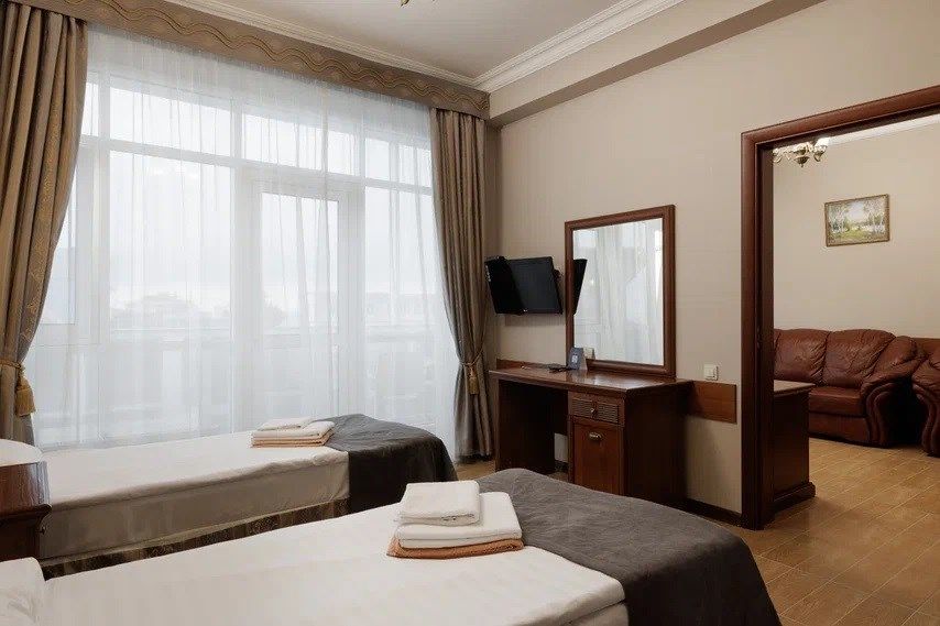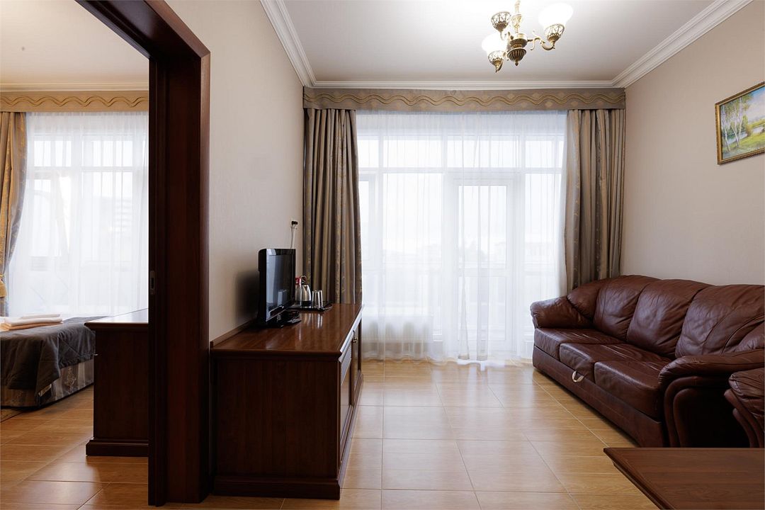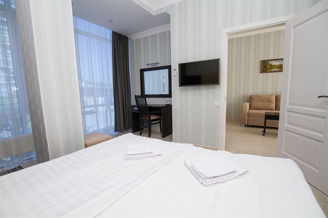 Двухкомнатный номер с балконом. Спальная комната: 2 односпальные кровати с прикроватными тумбочками туалетный столик, телевизор. Гостиная: набор мягкой кожаной мебели, шкаф, журнальный столик, тумба под телевизор и холодильник. Ванная комната : душ, санузел, фен, халаты, тапочки. Максимальная вместимость - до 4 человек.Услуги и удобства
